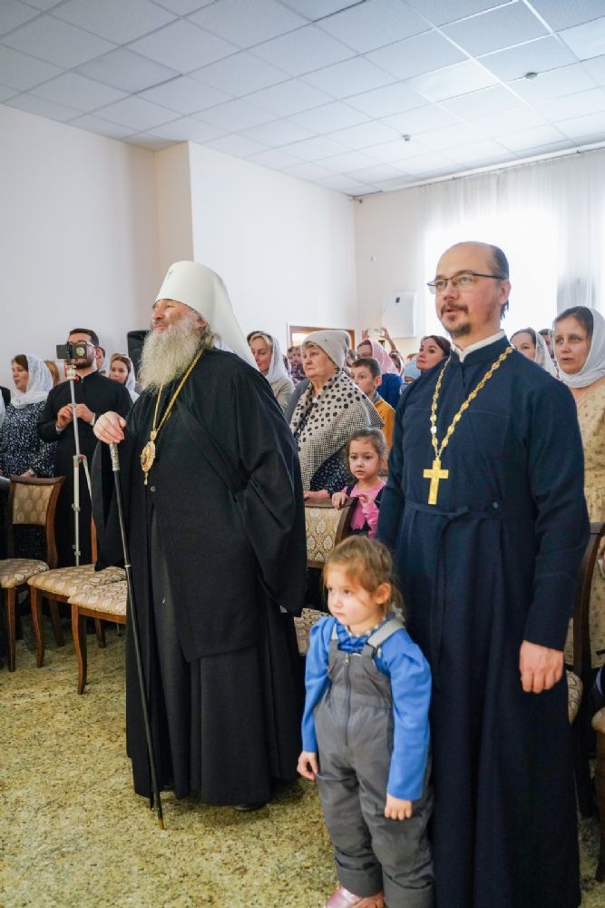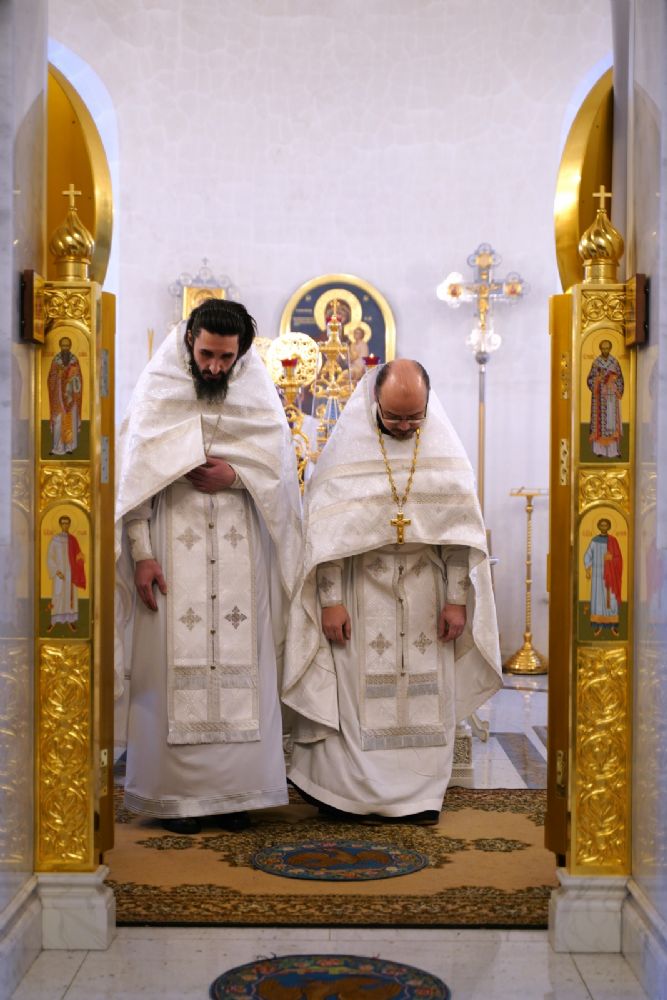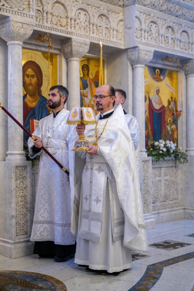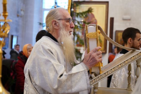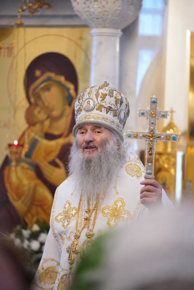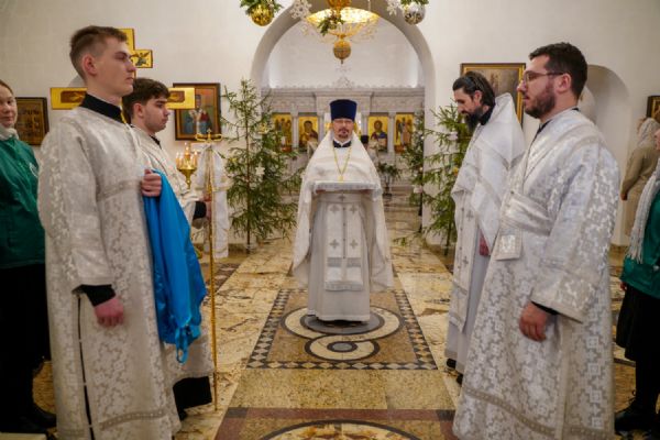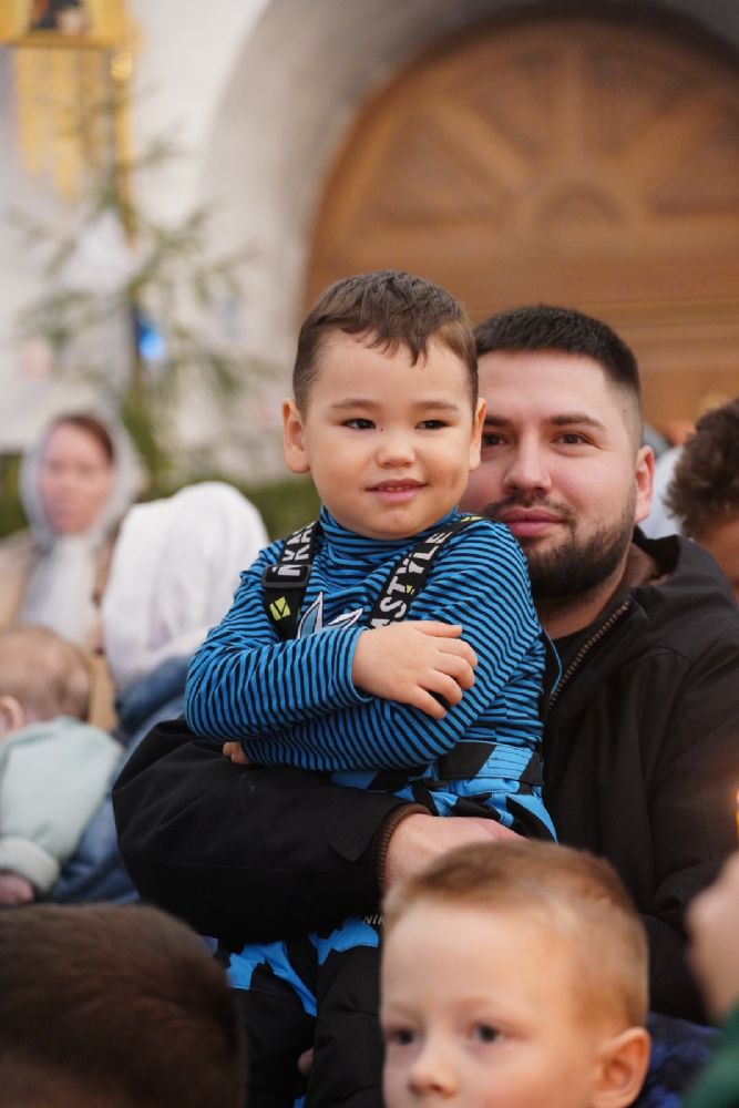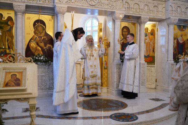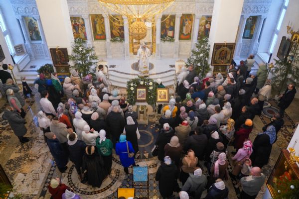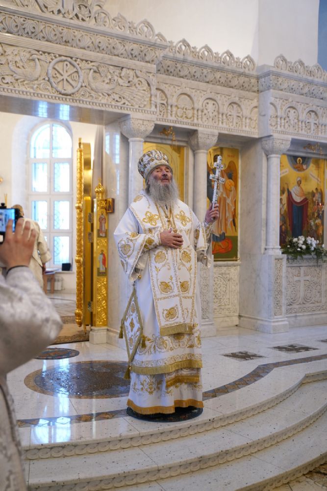 Архипастырю сослужили настоятель храма иерей Алексий Михеев, клирик храма иерей Василий Пряморуков и протодиакон Михаил Козловский. Песнопения исполняли хор храма под управлением Александры Ивановой и детский хор воскресной школы под руководством Ольги Шевчук.