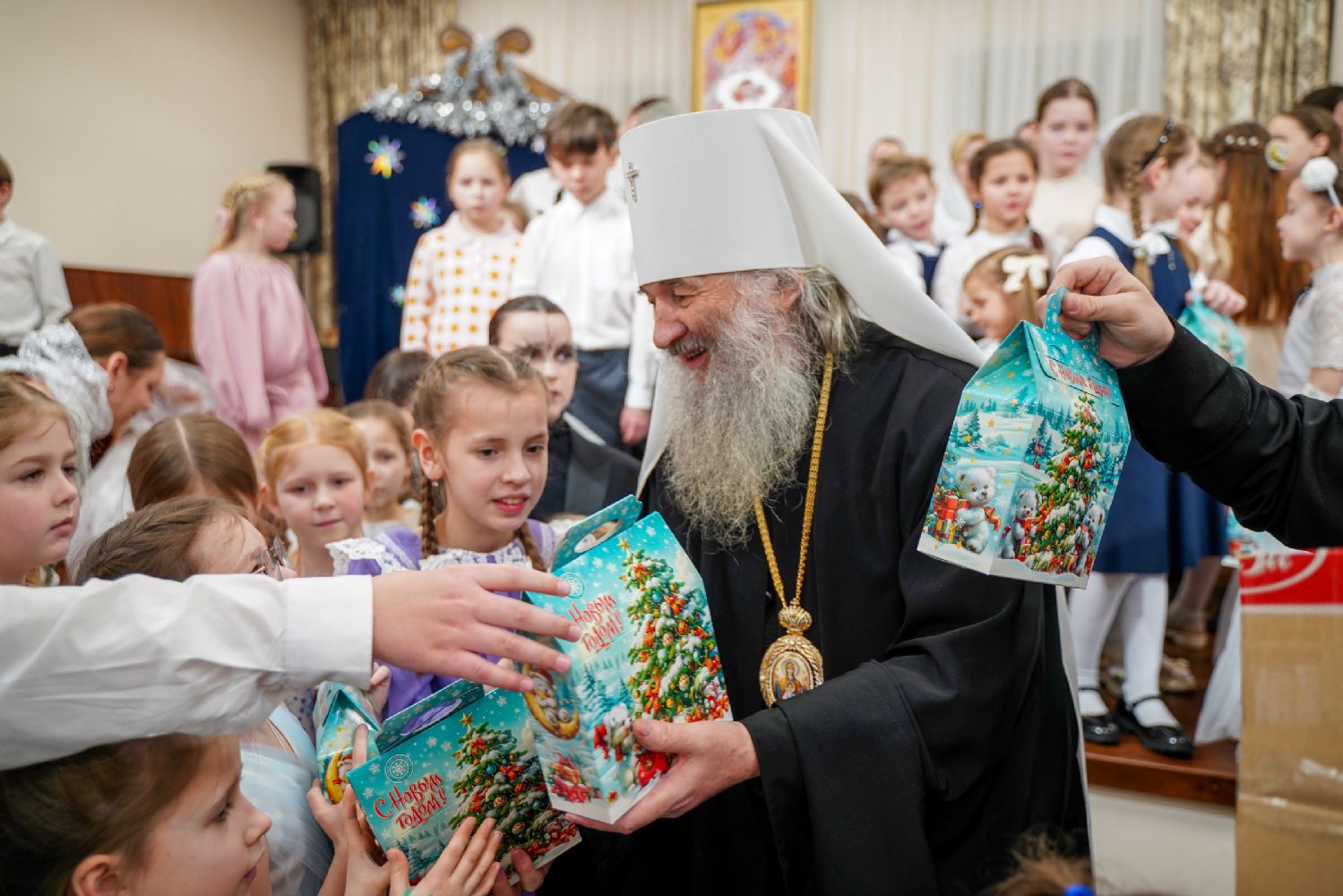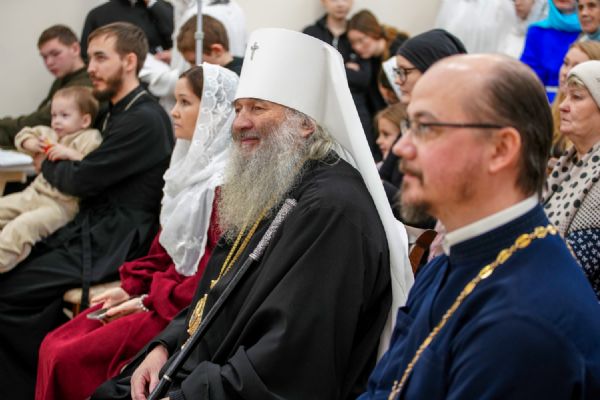 По завершении богослужения митрополит Иоанн посетил в воскресной школе храма рождественский концерт, по окончании которого вручил ребятам сладкие подарки.