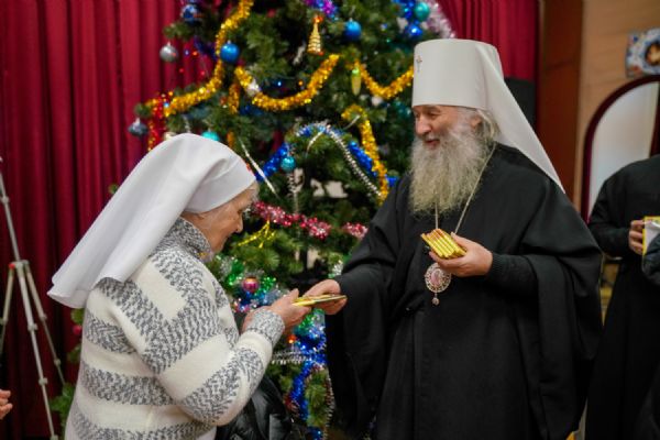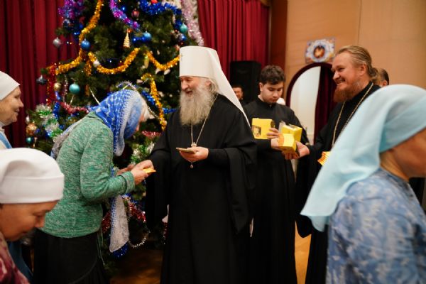 Сестры милосердия вручили архипастырю рождественский подарок, а владыка раздал всем собравшимся сладости.