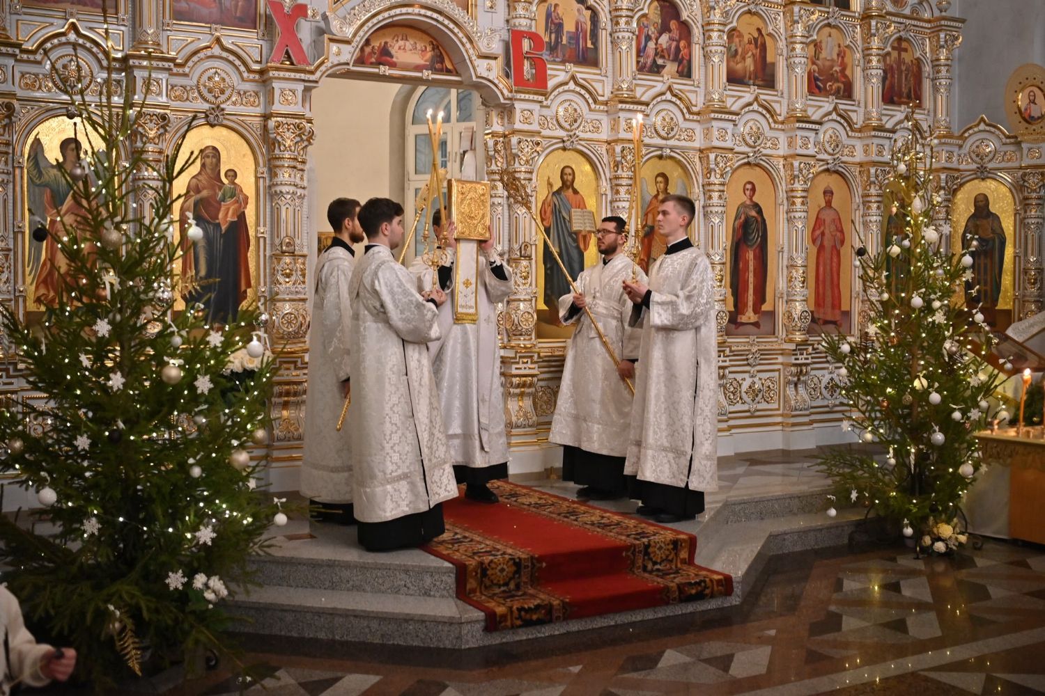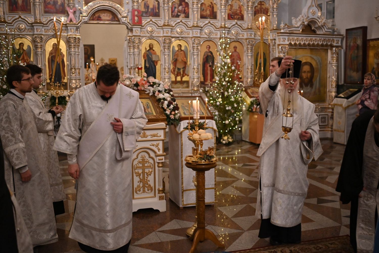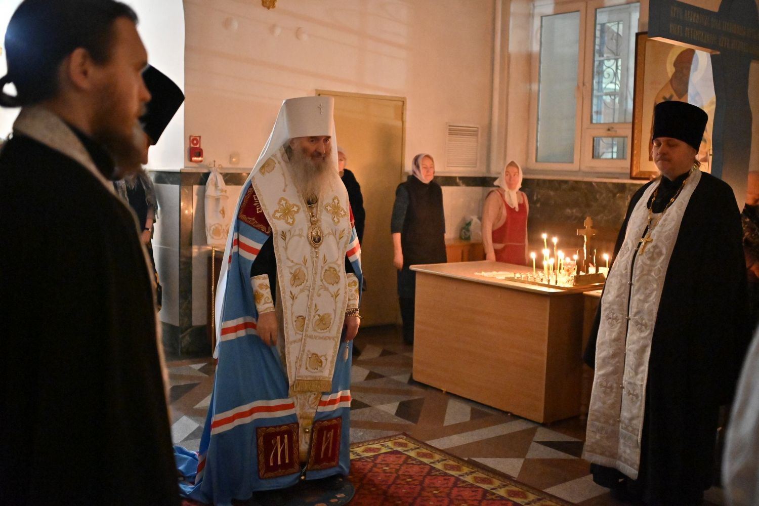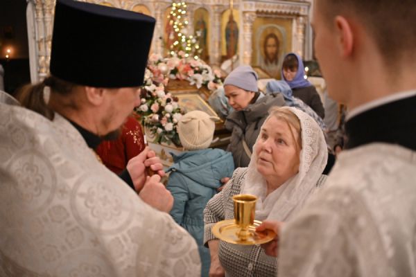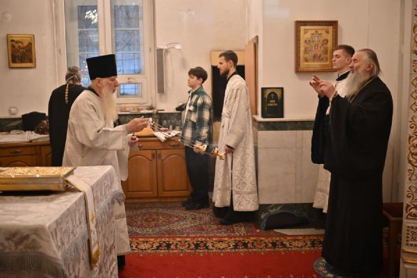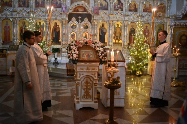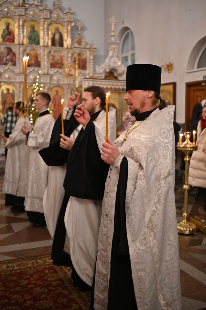 Владыке сослужили настоятель собора иерей Андрей Кочаков, клирики собора иерей Леонид Вылекжанин, иерей Димитрий Лукьянов и диакон Алексий Кузнецов, а также протодиакон Михаил Козловский. Песнопения исполнял хор собора под управлением Елены Поглазовой.