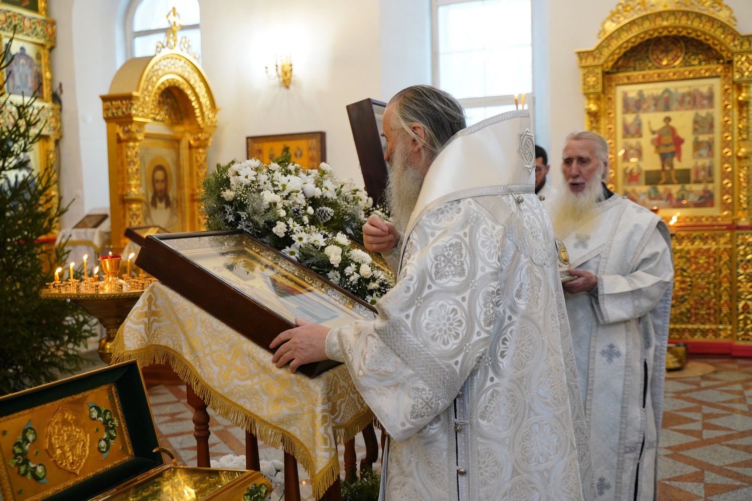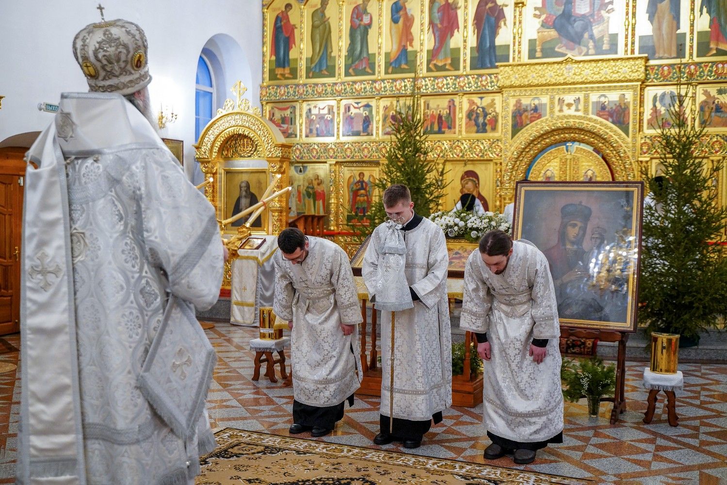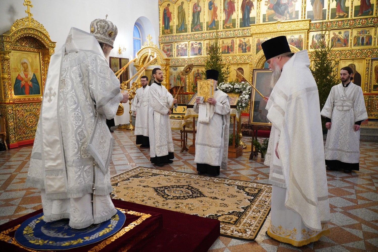 По завершении Литургии священнослужители в центре храма совершили славление Рождеству Христову и священномученику Михаилу, пресвитеру марийскому, затем митрополит Иоанн обратился к верующим с архипастырским словом.