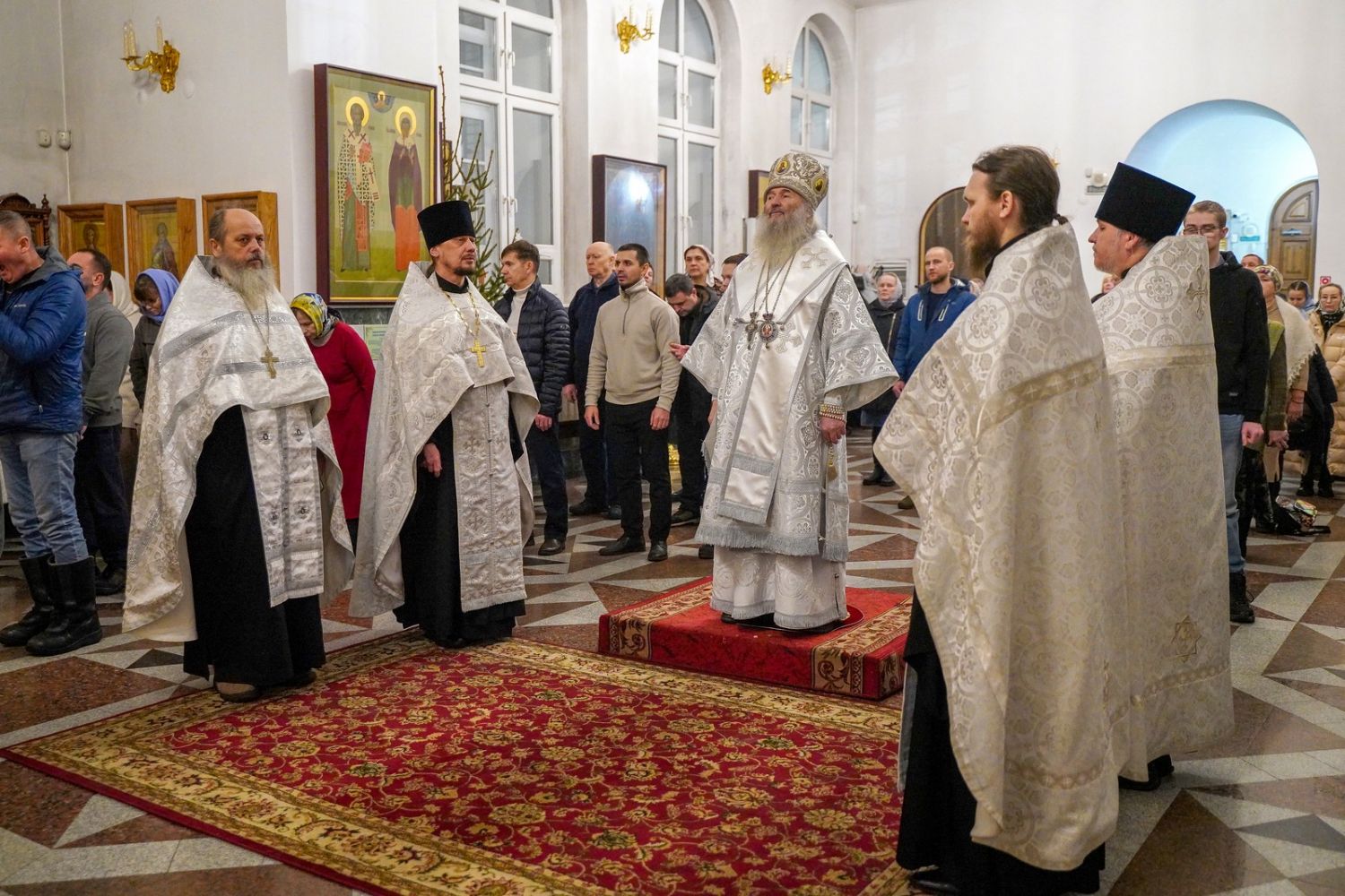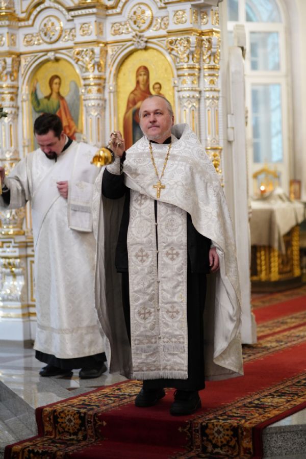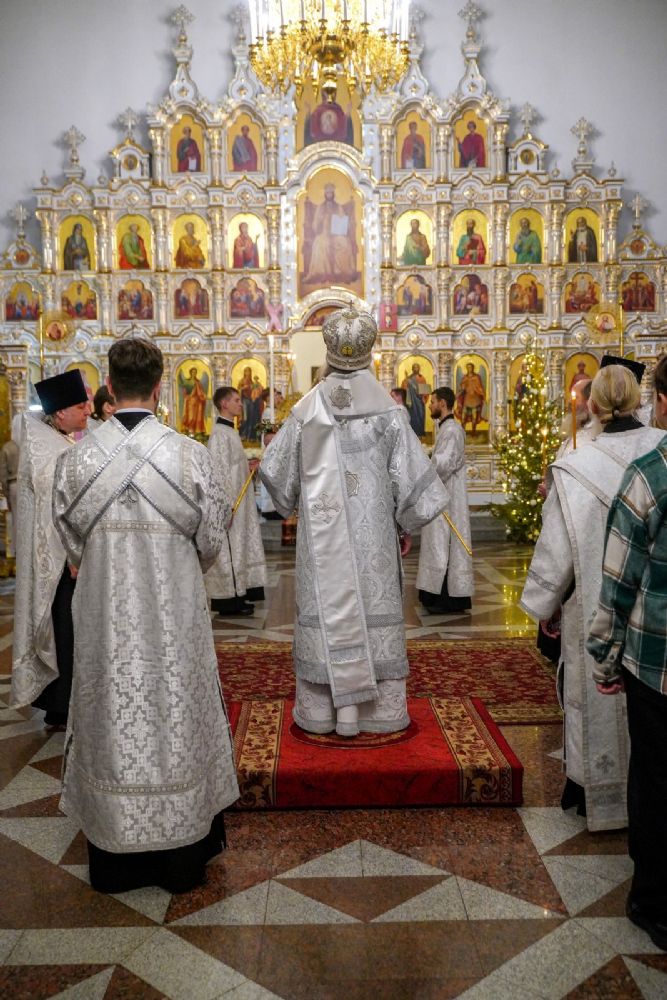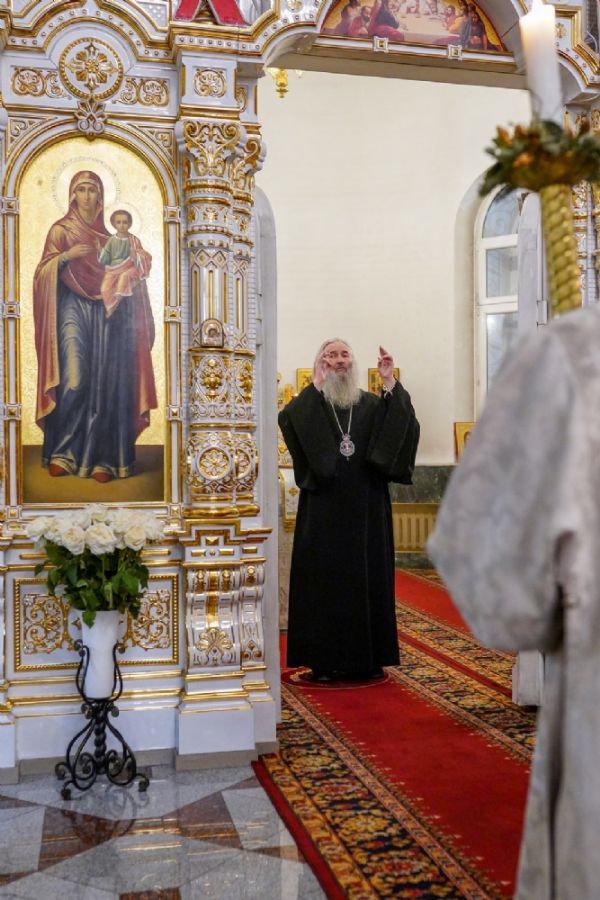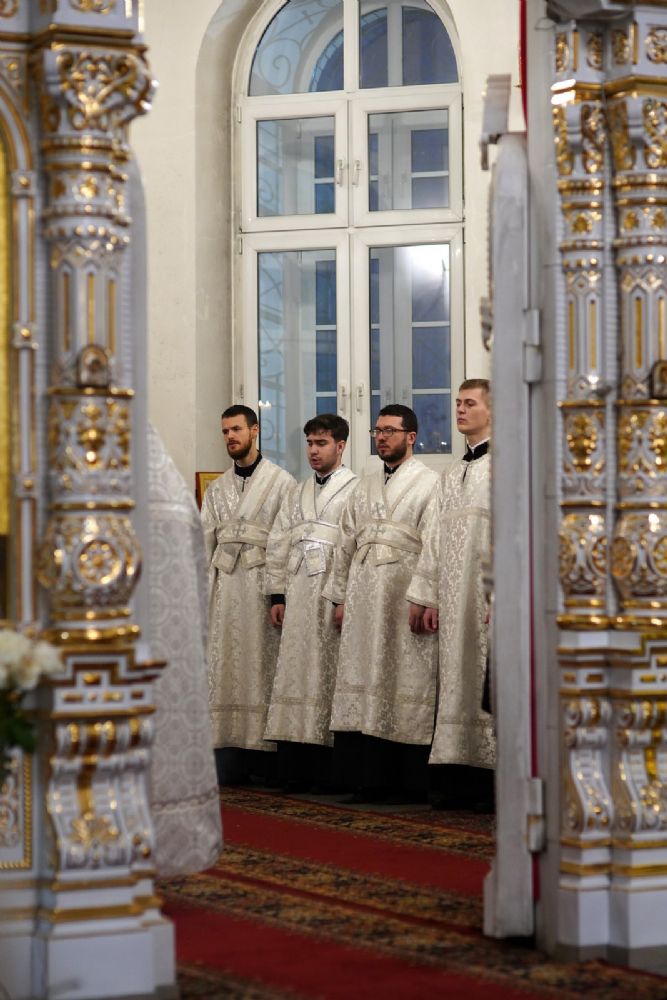 Владыке сослужили настоятель собора иерей Андрей Кочаков, клирики собора иерей Леонид Вылекжанин, иерей Димитрий Лукьянов и диакон Алексий Кузнецов, а также настоятель Сретенского храма с. Русский Кадам иерей Владимир Каплунов и протодиакон Михаил Козловский. Песнопения исполнял хор собора под управлением Елены Поглазовой.