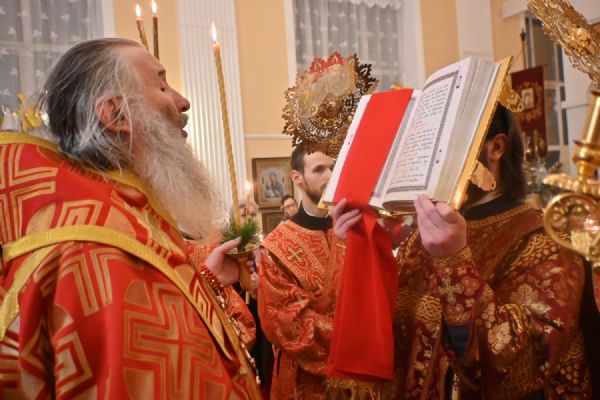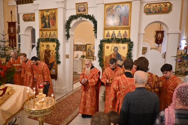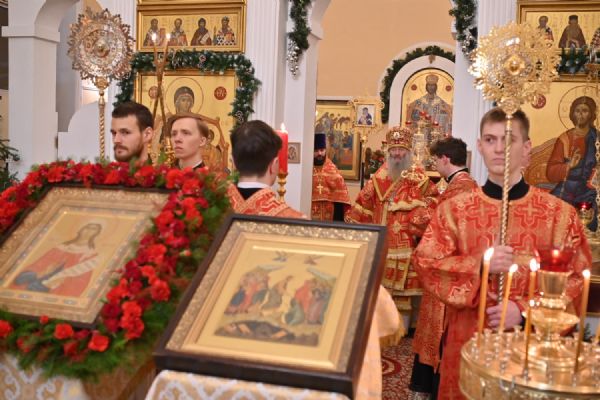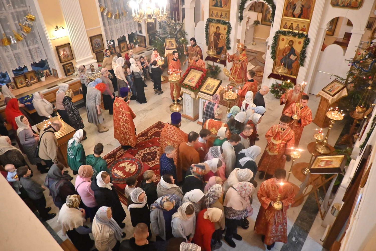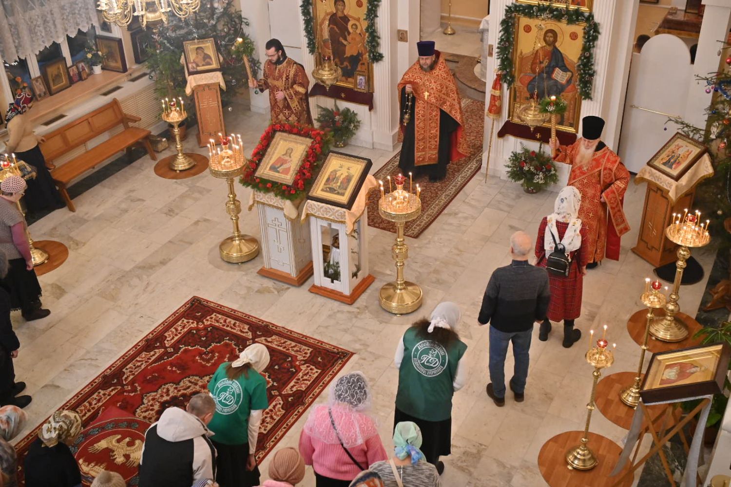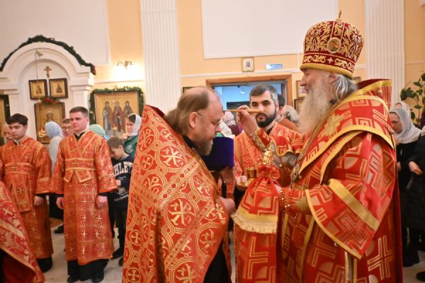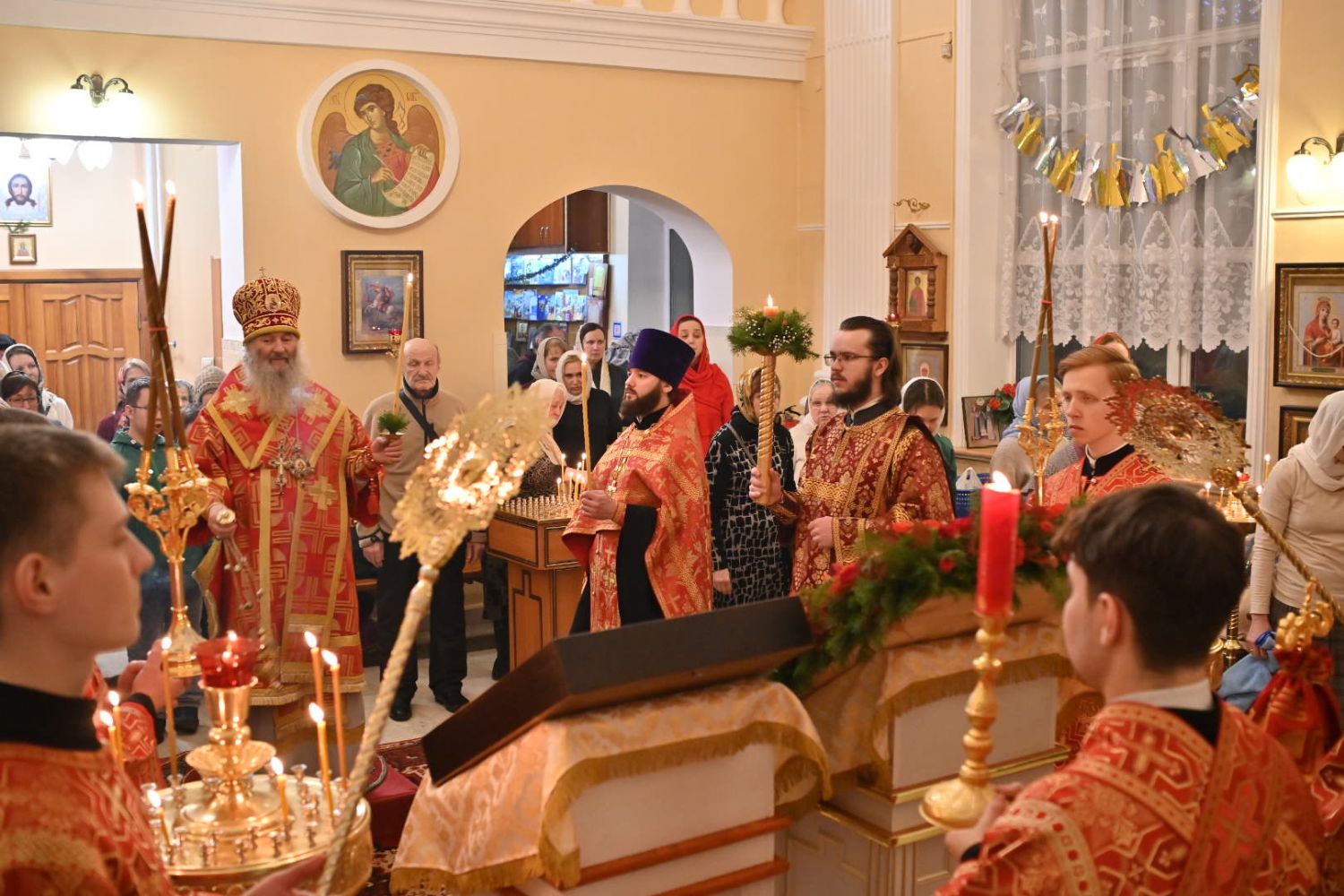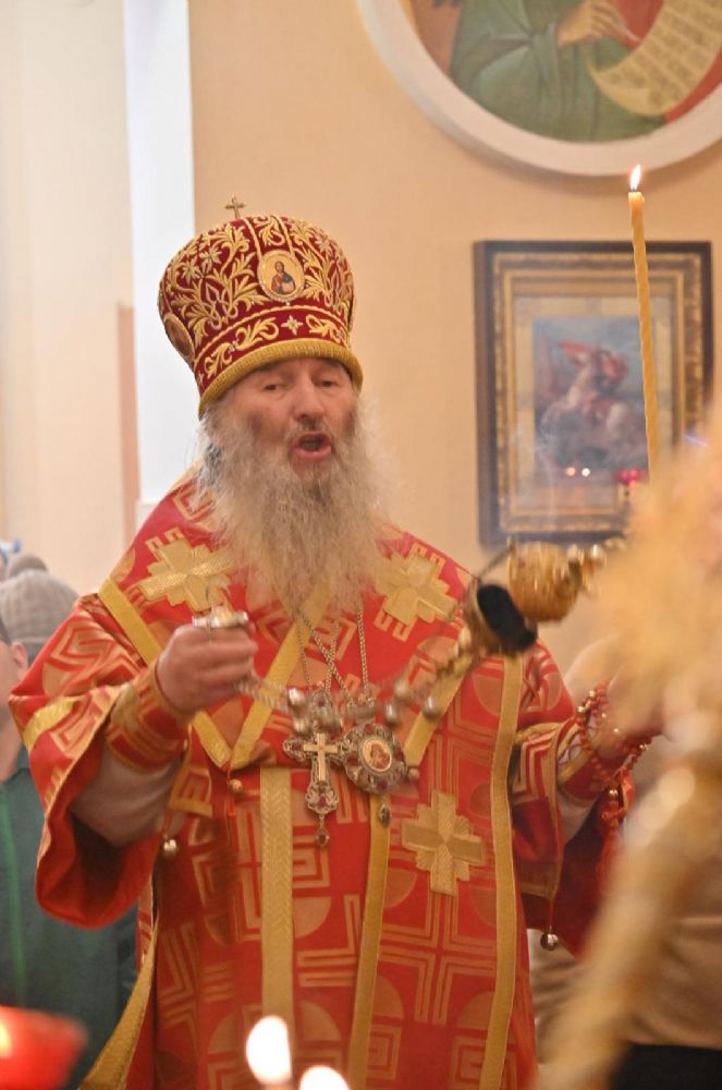 Архипастырю сослужили настоятель храма протоиерей Евгений Сурков, клирики храма иерей Андрей Иванов и диакон Никита Сурков, а также протодиакон Михаил Козловский. Песнопения исполнял хор храма под управлением регента Аллы Симаковой.