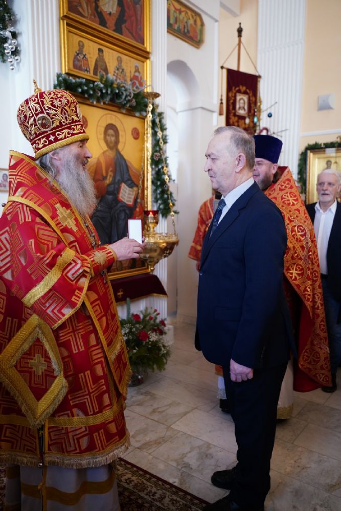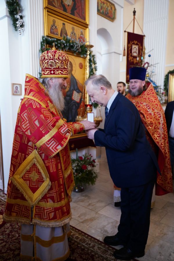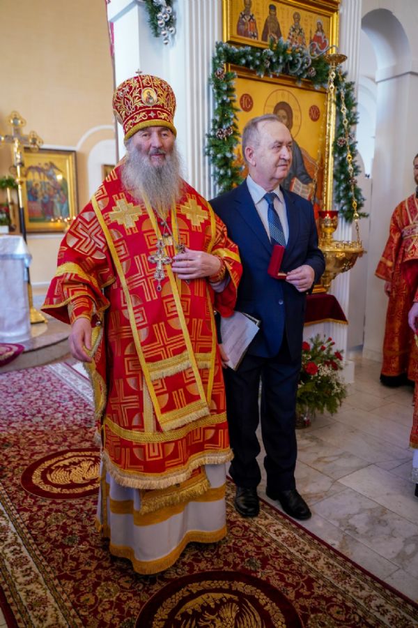 По завершении Литургии митрополит Иоанн вручил епархиальные награды – медалями священномученика Леонида, епископа Марийского, III степени награждены: ветеран ПГТУ, бывший ректор вуза Геннадий Сергеевич Ощепков и профессор кафедры отечественной истории МарГУ Сергей Валентинович Стариков.