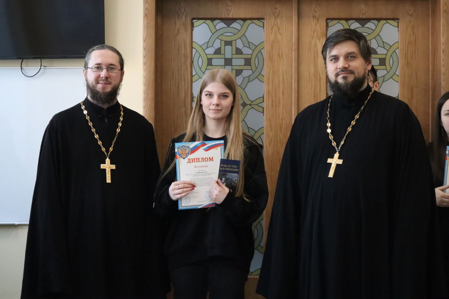 Дипломы призерам, а также сертификаты участникам конкурса вручили руководитель отдела по работе с молодежью Йошкар-Олинской епархии иерей Никита Иванов и помощник благочинного Йошкар-Олинского церковного округа по работе с молодежью, духовник Клуба православной молодежи «Пока горит свеча» МарГУ иерей Димитрий Копылов.
