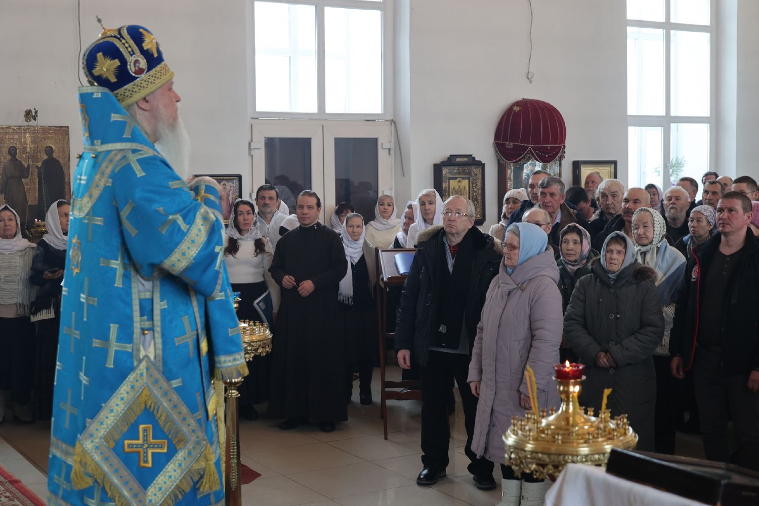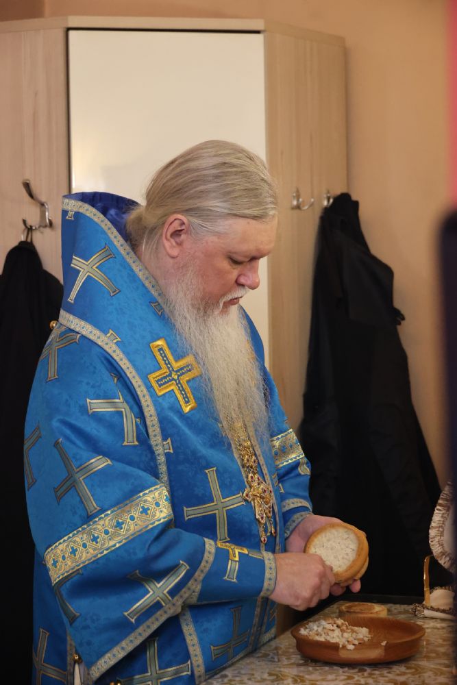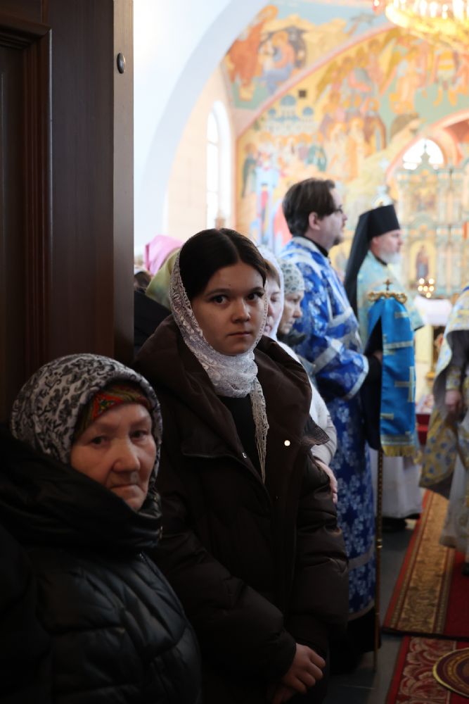 Также епископ Феофан напомнил о евангельских событиях праздника Сретения Господня. Ветхозаветный закон предписывал женщинам, родившим младенца мужского пола, по истечении 40 дней принести в храме благодарственную и очистительную жертву. И хотя Рождество Иисуса Христа не нарушило девства Пречистой Матери, Она, повинуясь закону, со смирением пришла во храм, неся на руках Богомладенца Христа.