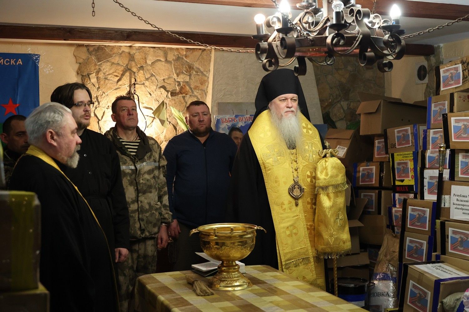 Перед отправкой груза, 1 марта, епископ Волжский и Сернурский Феофан в сослужении протоиерея Виталия Михеева совершил освящение гуманитарной помощи.
