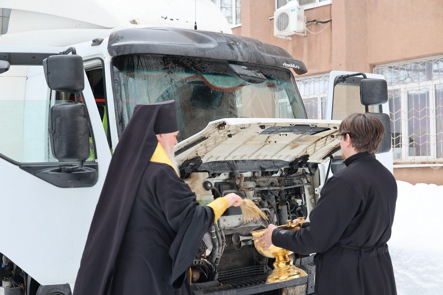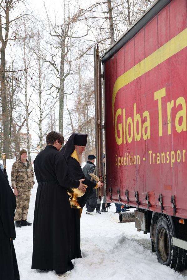 Архипастырь окропил святой водой транспорт, собранный груз, а также организаторов и добровольцев, которые участвуют в сборе и доставке гуманитарной помощи защитникам Святой Руси в зону СВО, и пожелал помощи Божией в пути.