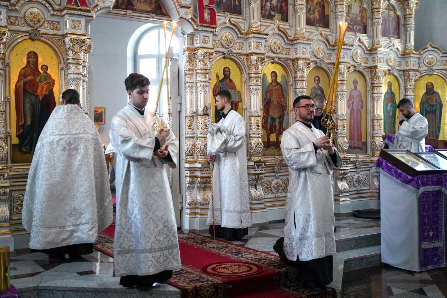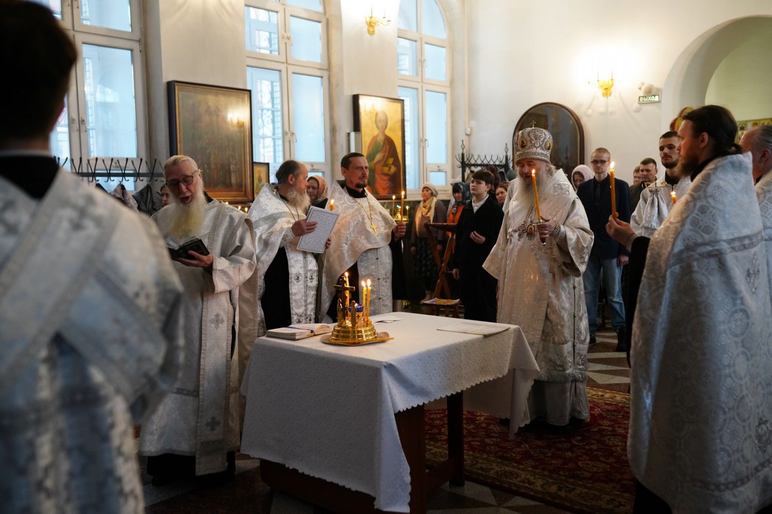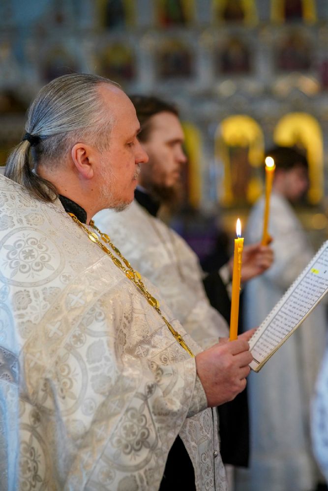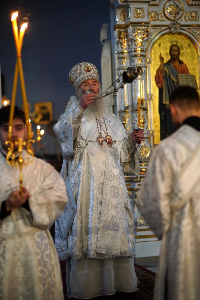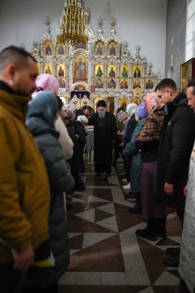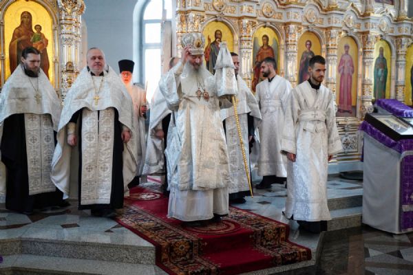Владыке сослужили настоятель собора иерей Андрей Кочаков, клирики собора иерей Леонид Вылекжанин и иерей Димитрий Лукьянов, а также настоятель Сретенского храма с. Русский Кадам иерей Владимир Каплунов и протодиакон Михаил Козловский. Песнопения исполнял хор собора под управлением Елены Поглазовой.