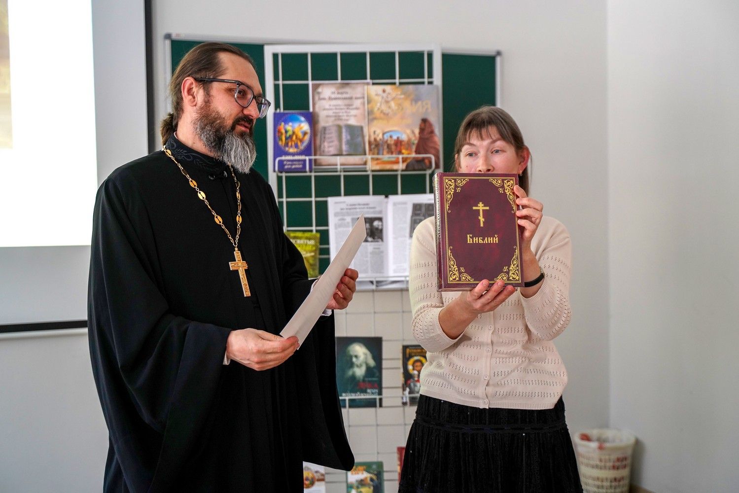 Экземпляр Библии на марийском языке отец Димитрий передал в дар библиотеке Медколледжа. А переводчик Института перевода Библии Лариса Николаевна Орзаева рассказала, как велась эта масштабная работа.