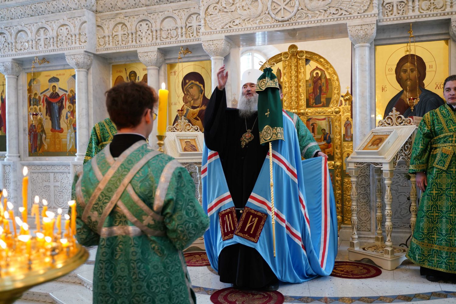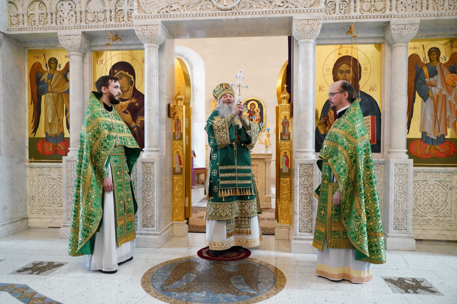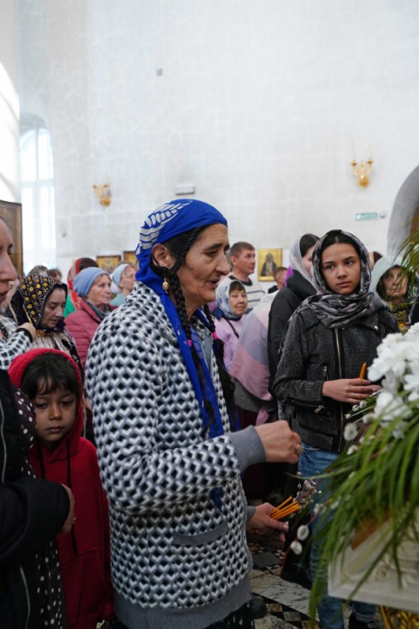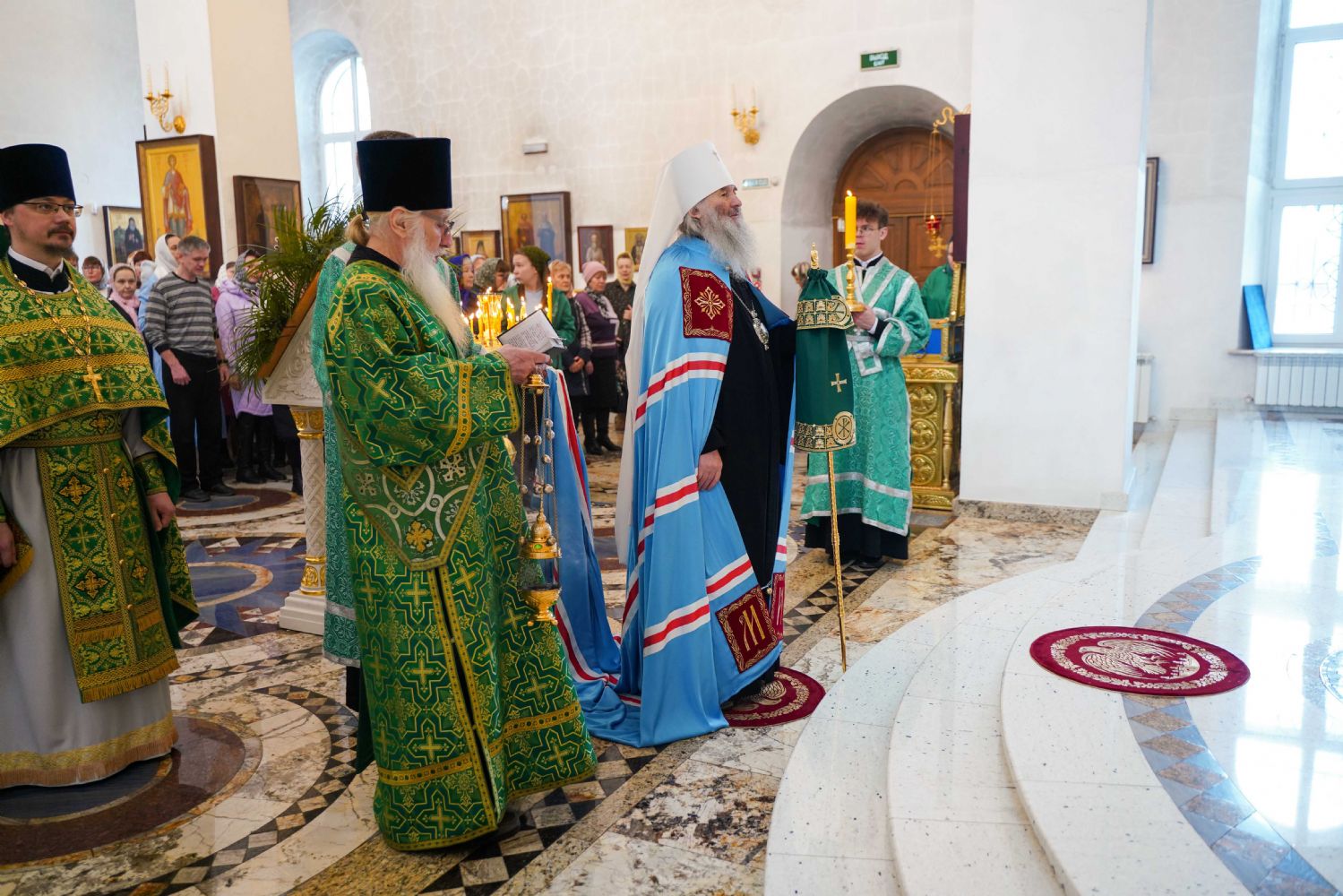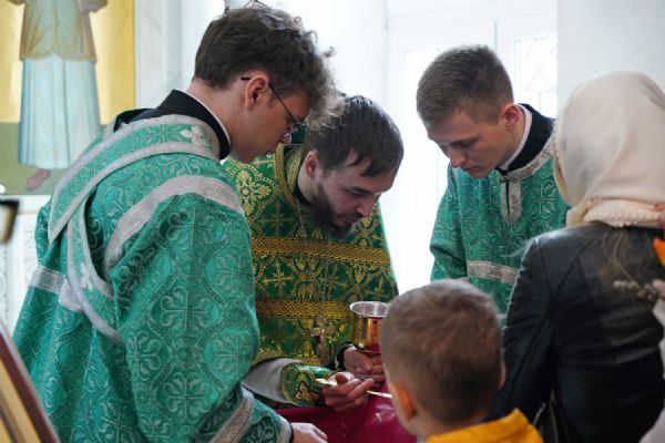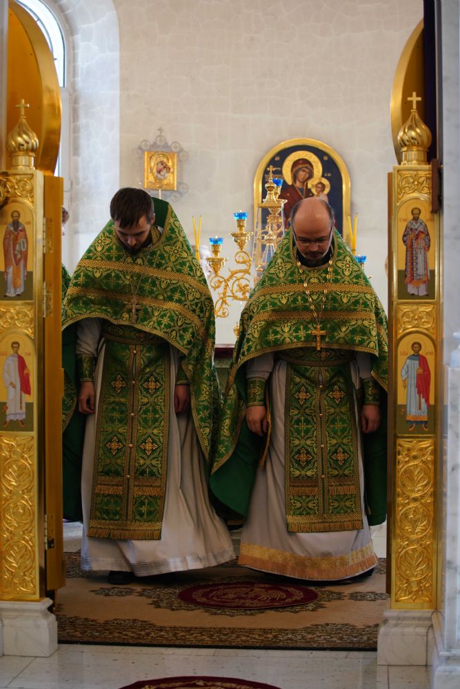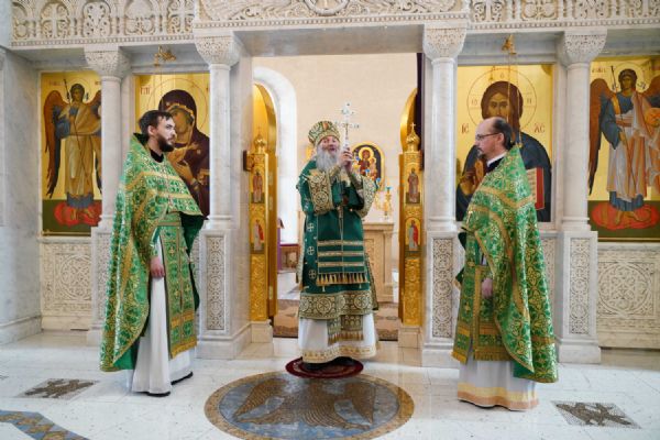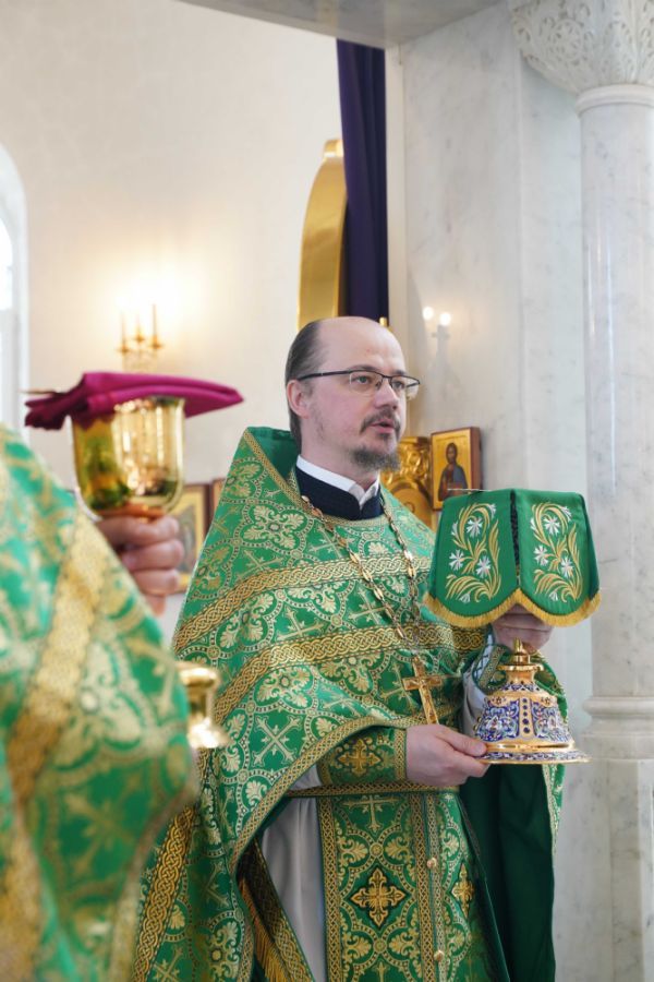 Архипастырю сослужили настоятель храма иерей Алексий Михеев, клирик храма иерей Сергий Пуртов и протодиакон Михаил Козловский. Песнопения исполняли хор храма под управлением Александры Ивановой и детский хор воскресной школы под руководством Ольги Шевчук.