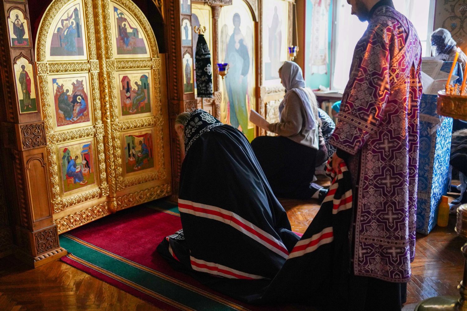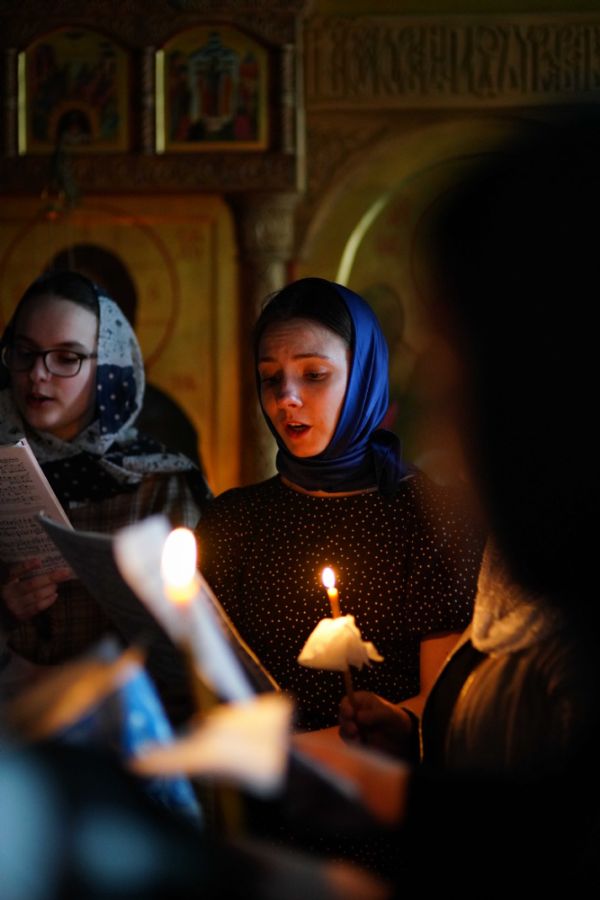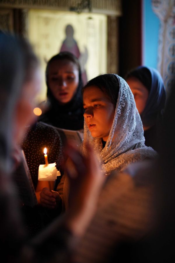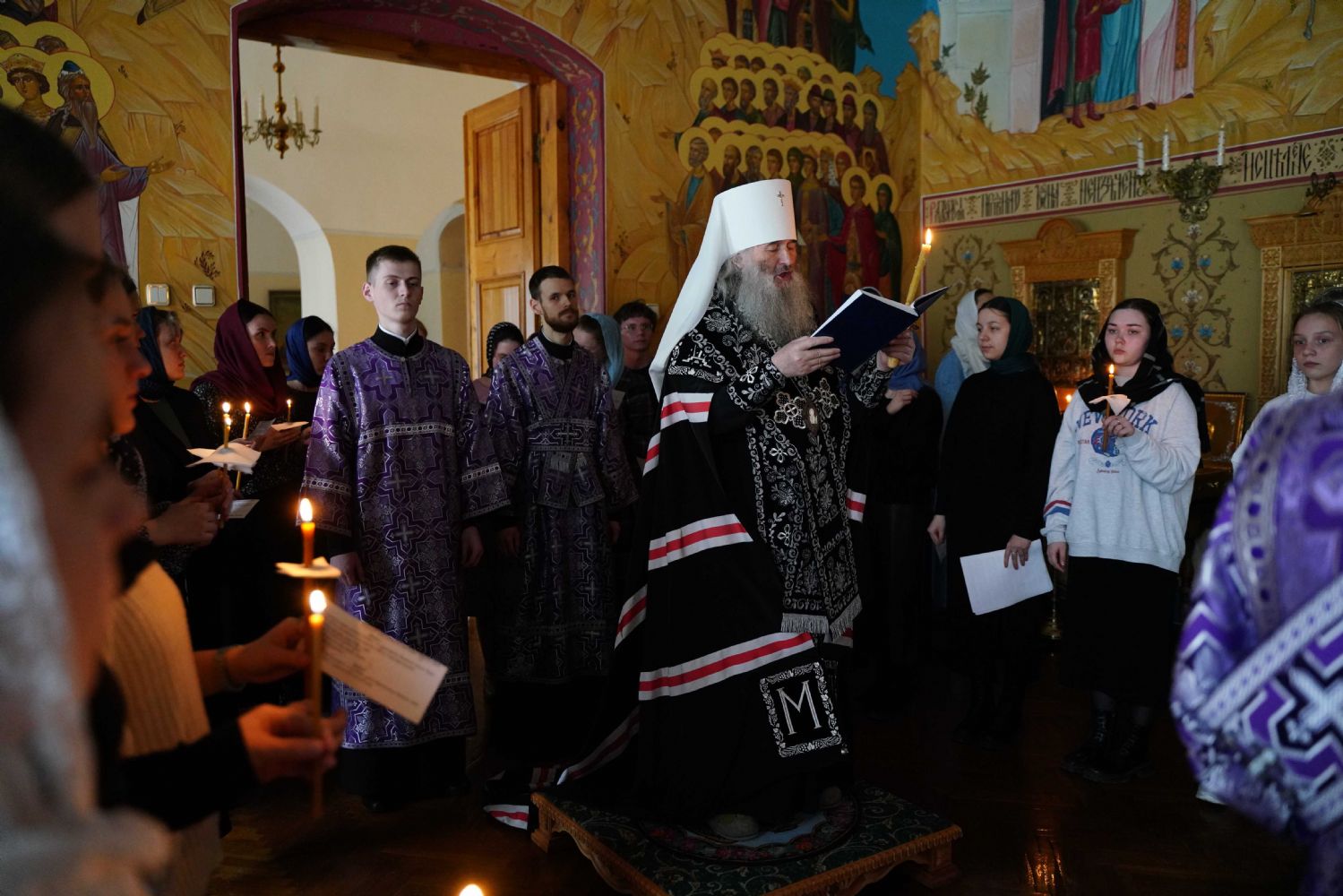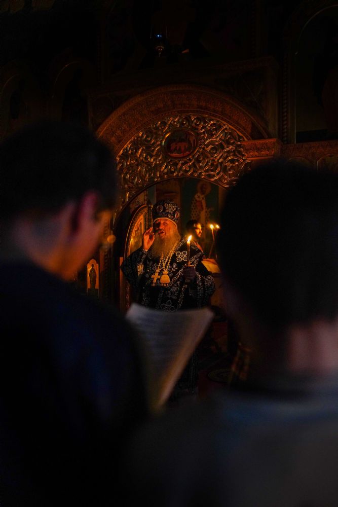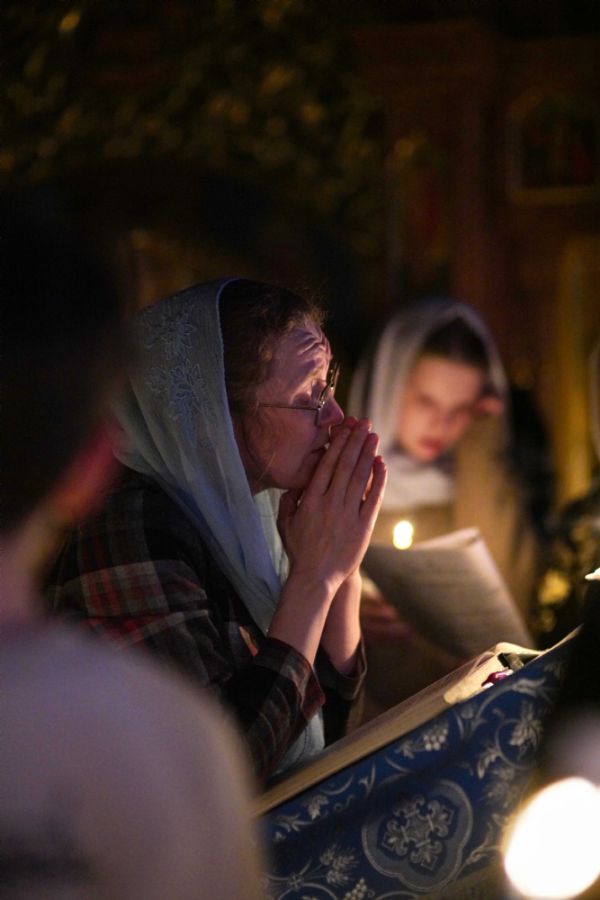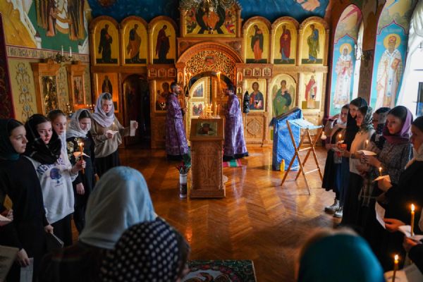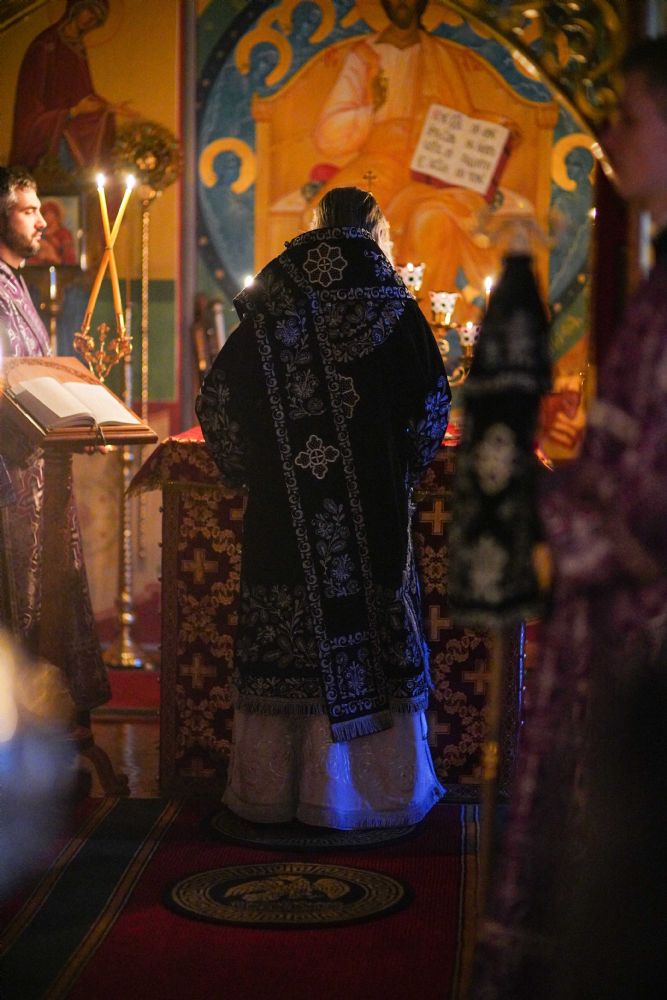На повечерии владыка в центре храма читал трипеснец (канон из 3-х песней) преподобного Андрея Критского. Евангельские чтения на утрене были посвящены Входу Господа в Иерусалим, проклятию бесплотной смоковницы и притче о злых виноградарях (Мф. 21:18-43).