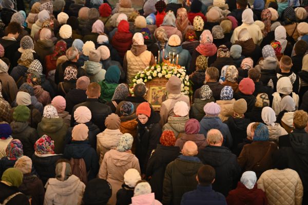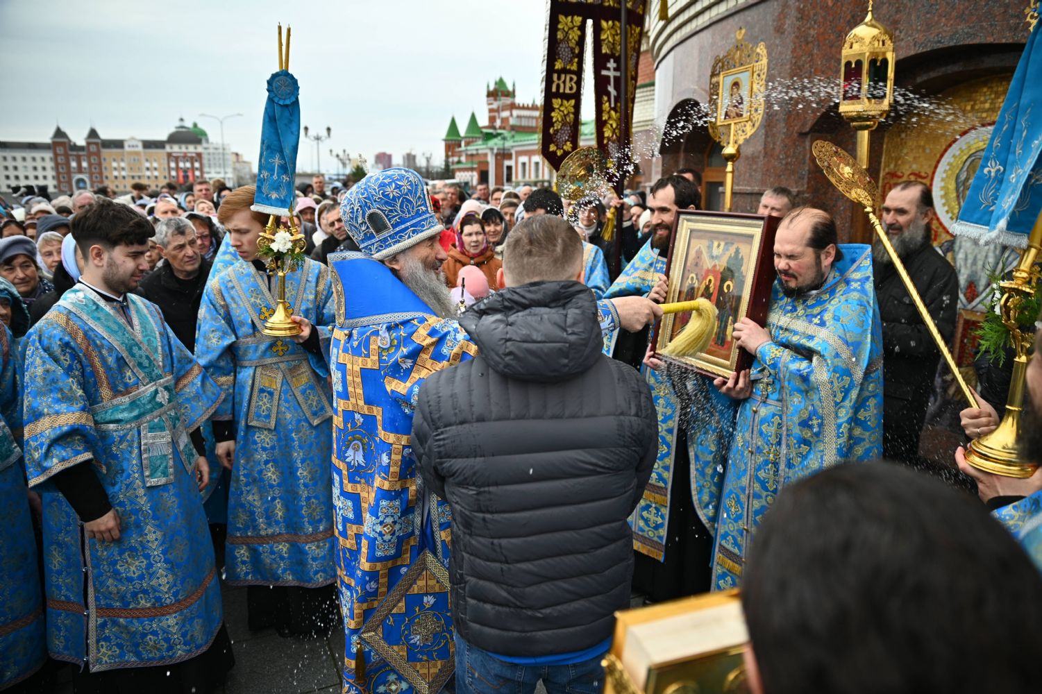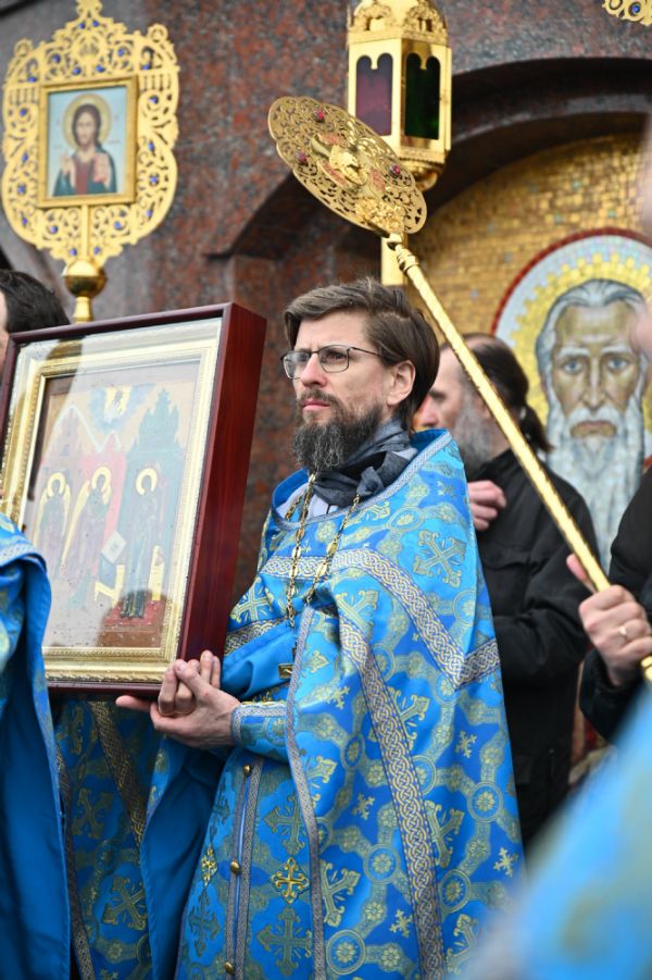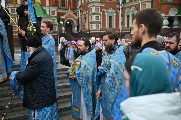 После Литургии в ознаменование престольного праздника состоялся крестный ход вокруг храма с чтением Евангелия и кроплением святой водой. По традиции, священство и миряне подошли к скульптурной композиции «Пресвятая Богородица с Младенцем Христом». Здесь верующие вознесли соборную молитву Покровительнице нашего края.