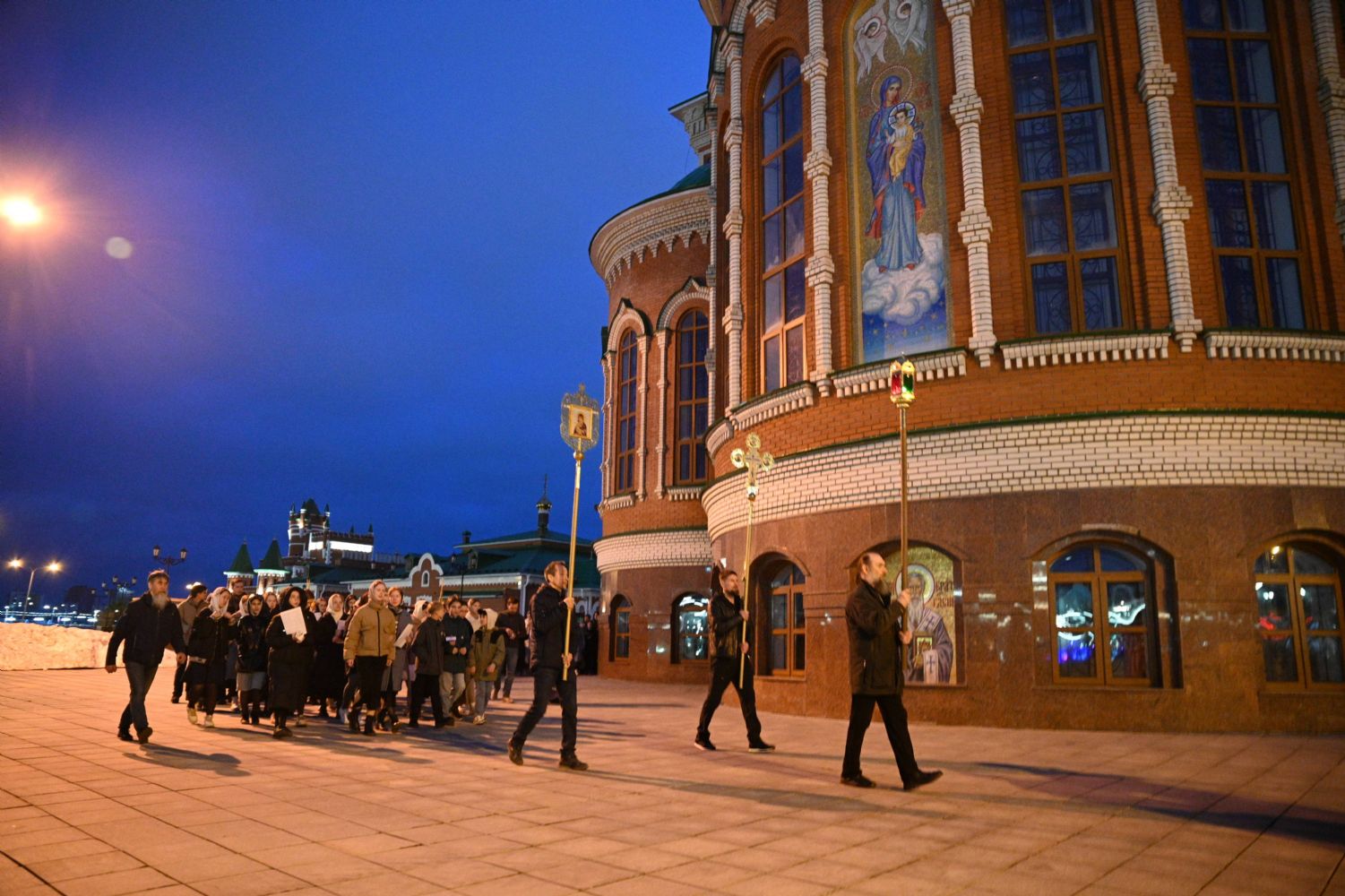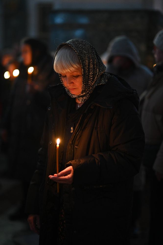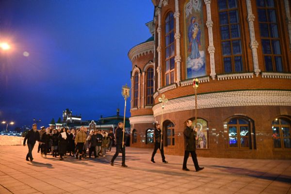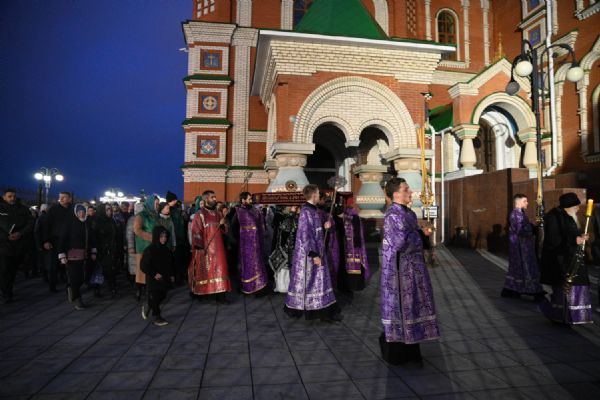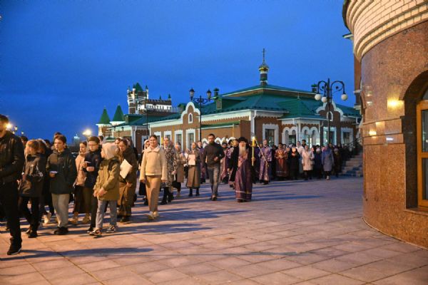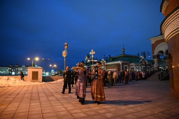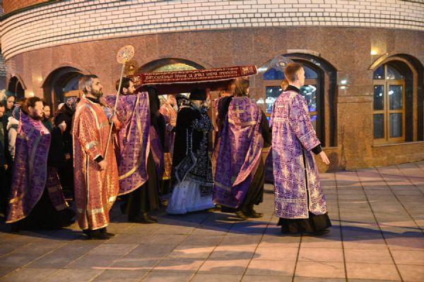 После канона и великого славословия при пении «Святый Боже» и погребальном перезвоне колоколов Плащаница крестным ходом была обнесена вокруг храма в воспоминание погребения Христова, сошествия Его во ад и победы над смертью.