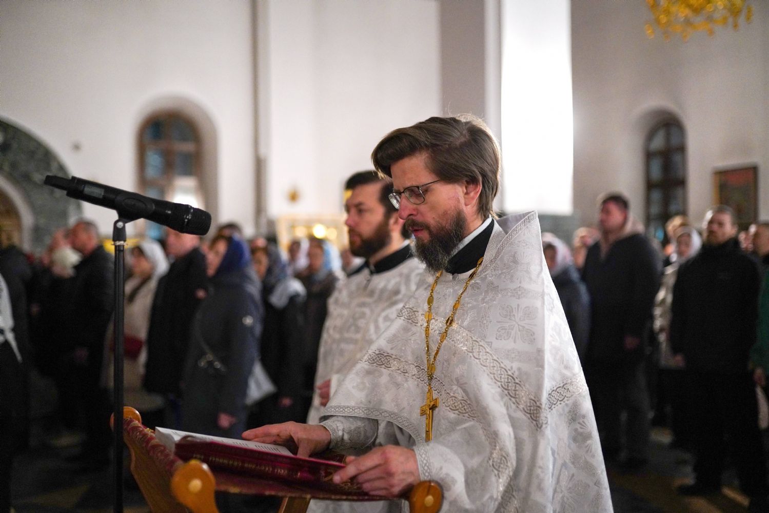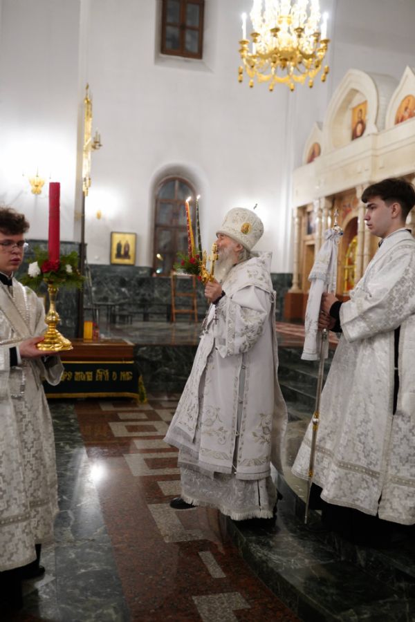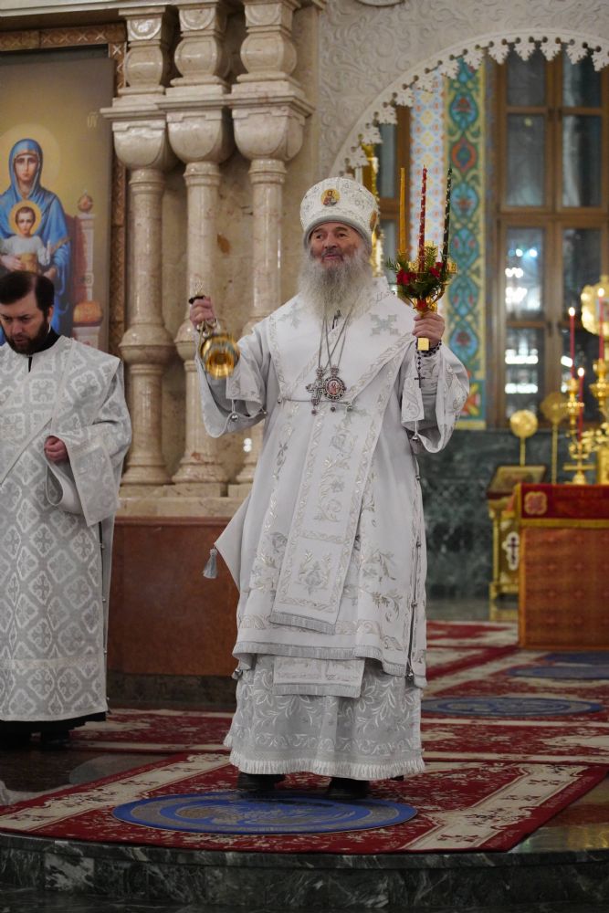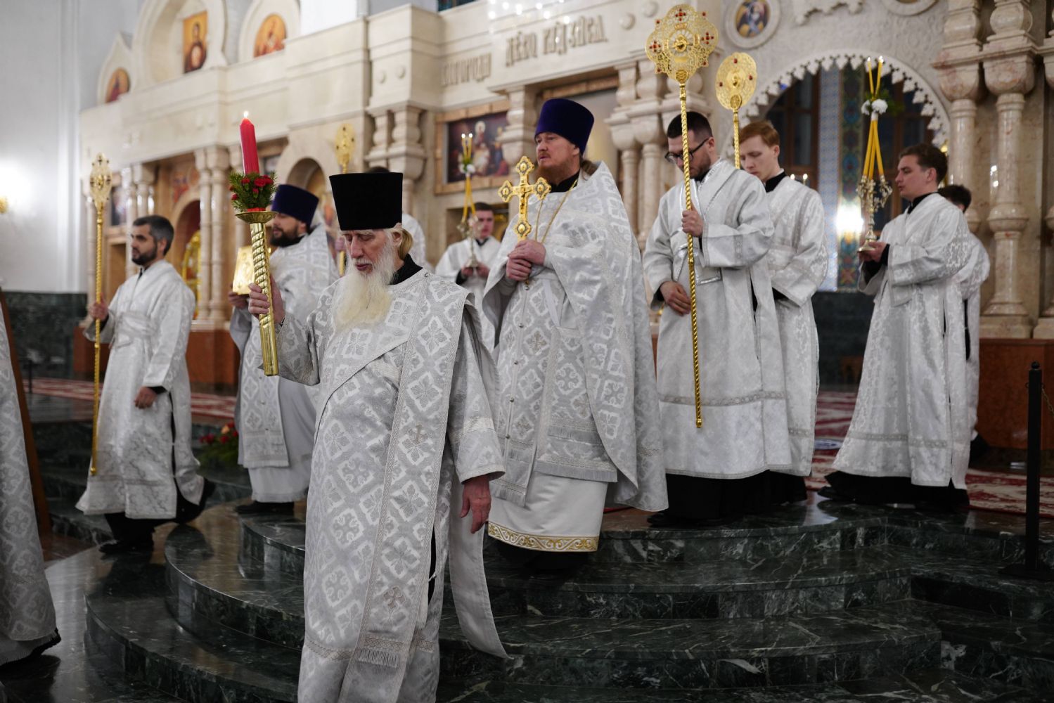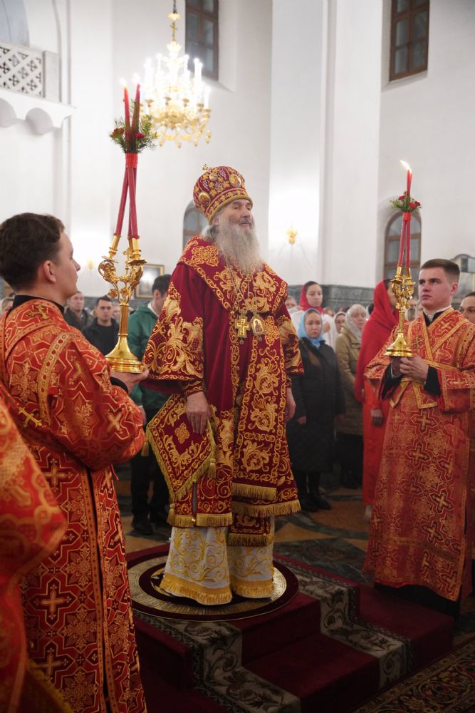 Владыке сослужили ключарь собора протоиерей Сергий Поглазов, клирики собора и протодиакон Михаил Козловский. Богослужебные песнопения исполняли старший и младший составы детско-юношеского хора «Благовест» под руководством регентов Татьяны Черновой и Надежды Поздеевой.