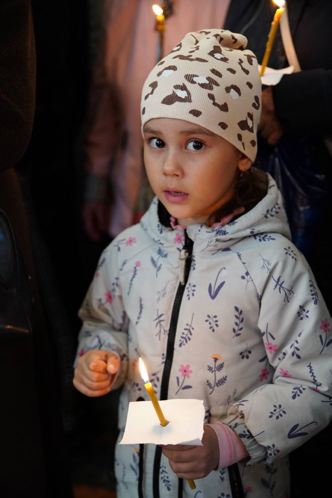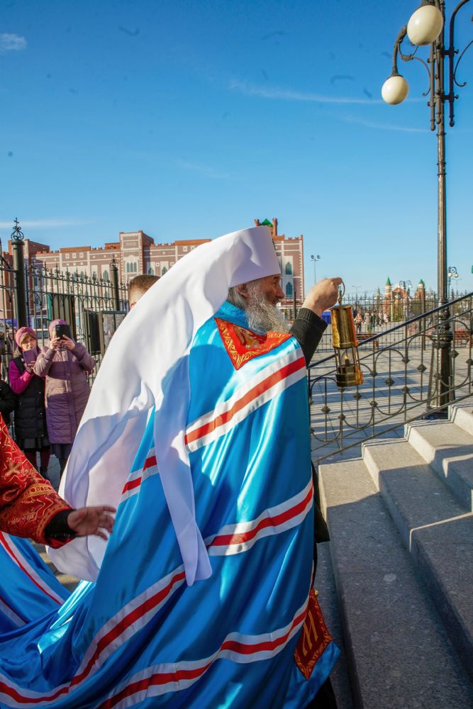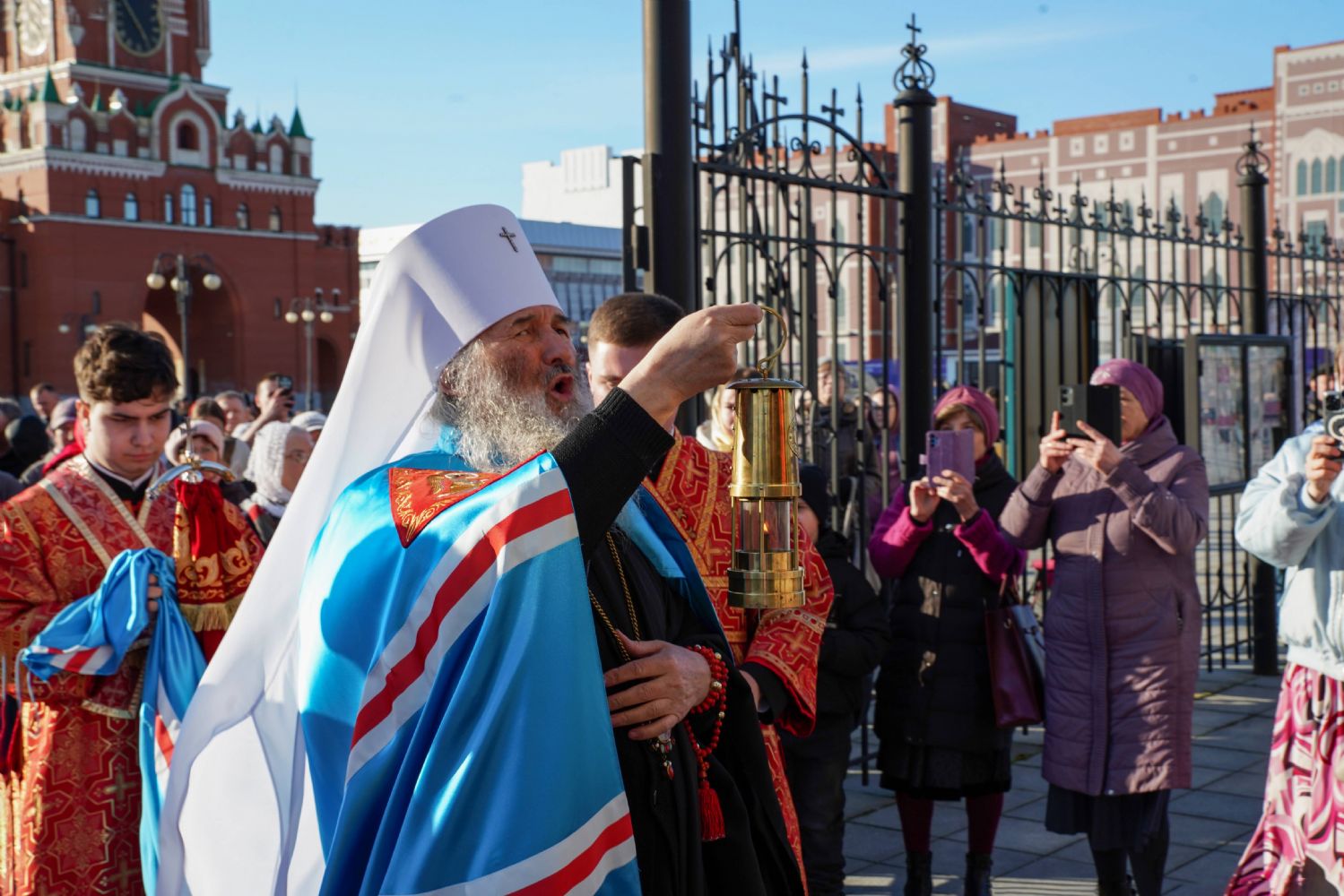 Перед началом богослужения духовенство и верующие встретили Благодатный огонь, который был доставлен на самолете из Храма Воскресения Христова (Гроба Господня) г. Иерусалима в Чебоксары, а оттуда привезен в Йошкар-Олинскую епархию. Владыка Иоанн внес зажженную лампаду в алтарь, а священники раздали огонь прихожанам, которые молились, держа горящие свечи в руках.