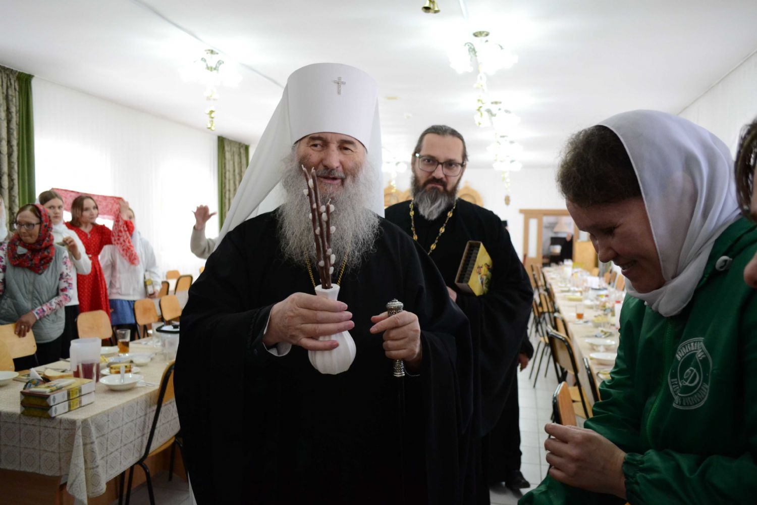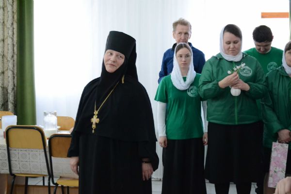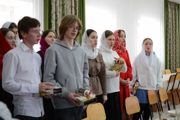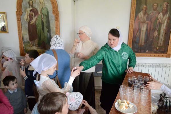 После трапезы митрополит Иоанн поздравил игумению Варнаву и насельниц обители с праздником Пасхи и вручил сладкие подарки. В завершение перед собравшимися с пасхальным концертом выступили воспитанники монастырской воскресной школы, а владыка одарил детей сладостями.