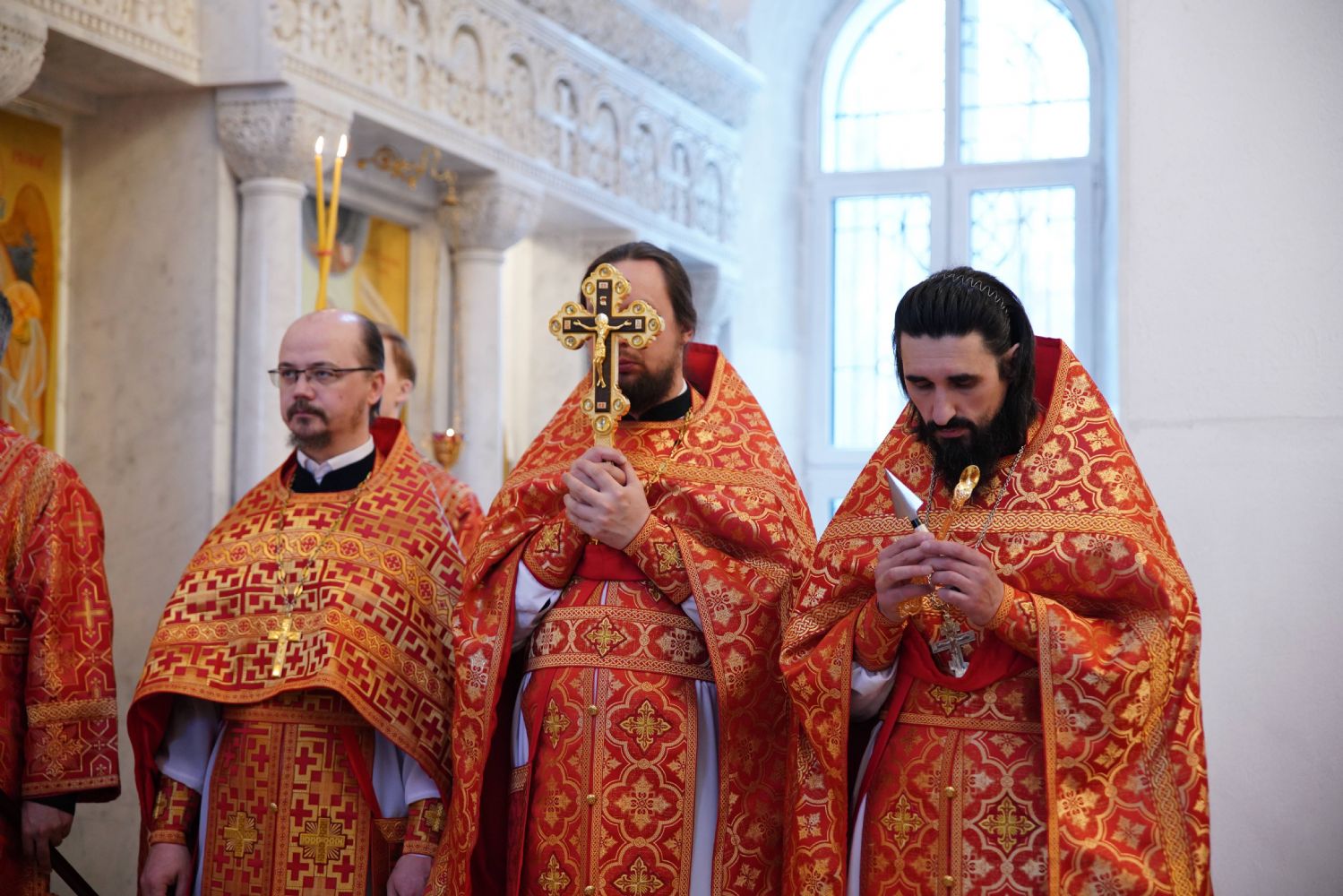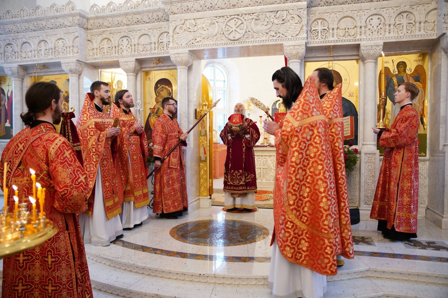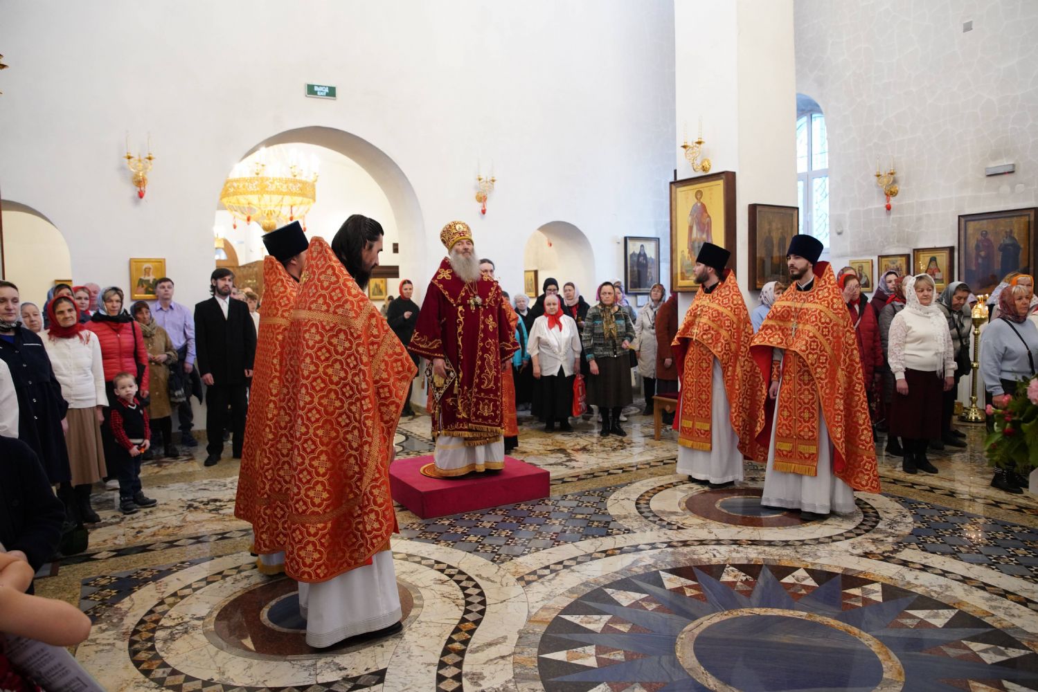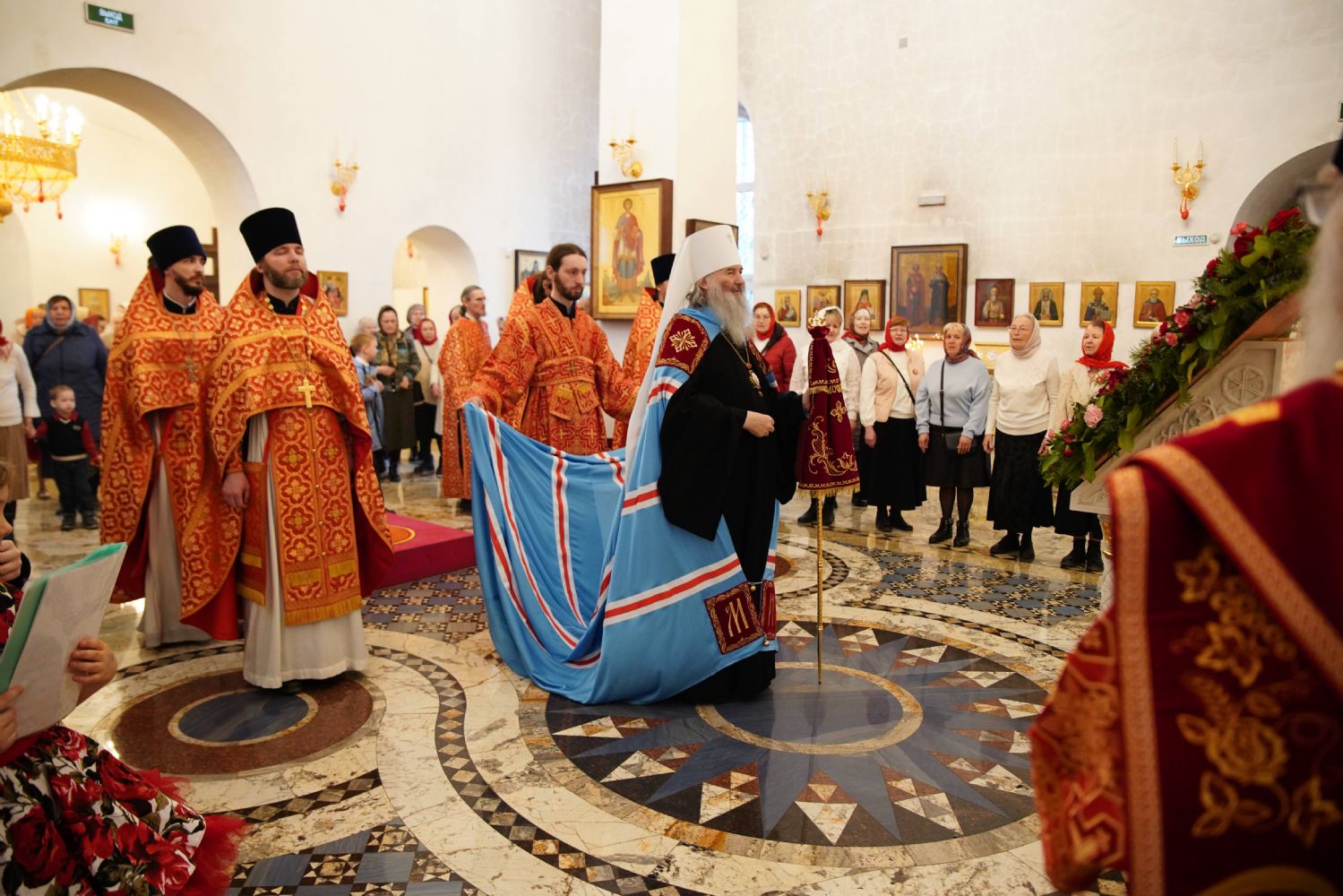 Его Высокопреосвященству сослужили настоятель храма иерей Алексий Михеев, клирики храма иереи Алексий Кирюшкин, Игорь Коваль, Сергий Пуртов и Василий Пряморуков, а также протодиакон Михаил Козловский. Песнопения исполняли хор храма под управлением Александры Ивановой и детский хор воскресной школы под руководством Ольги Шевчук.