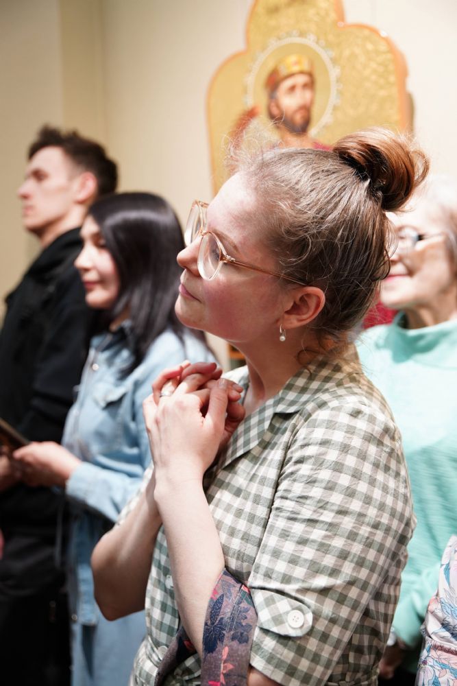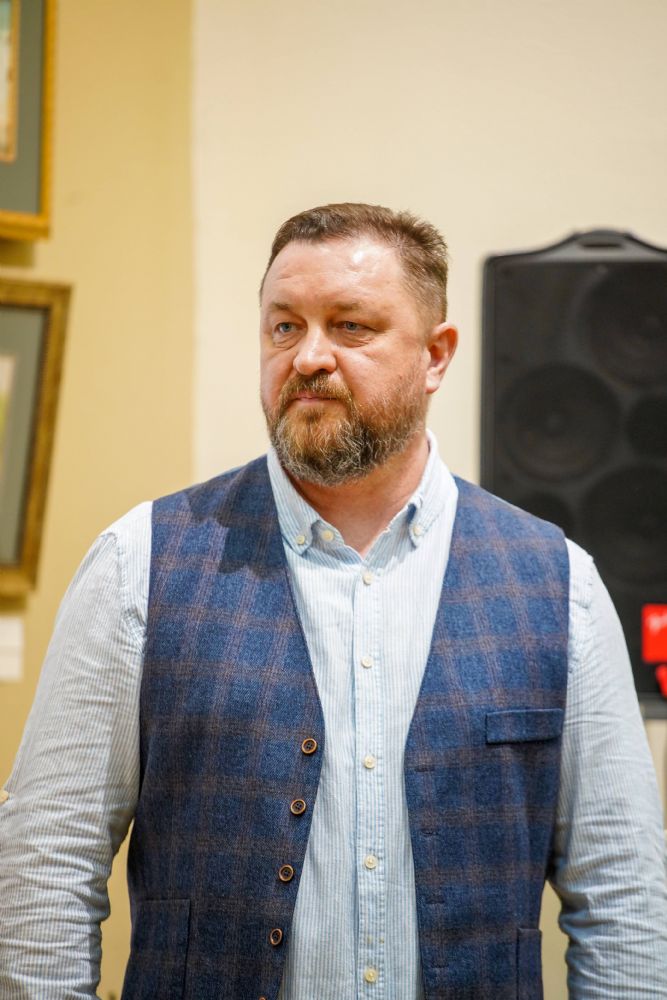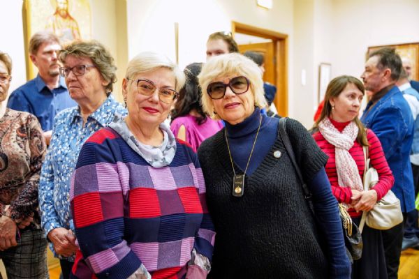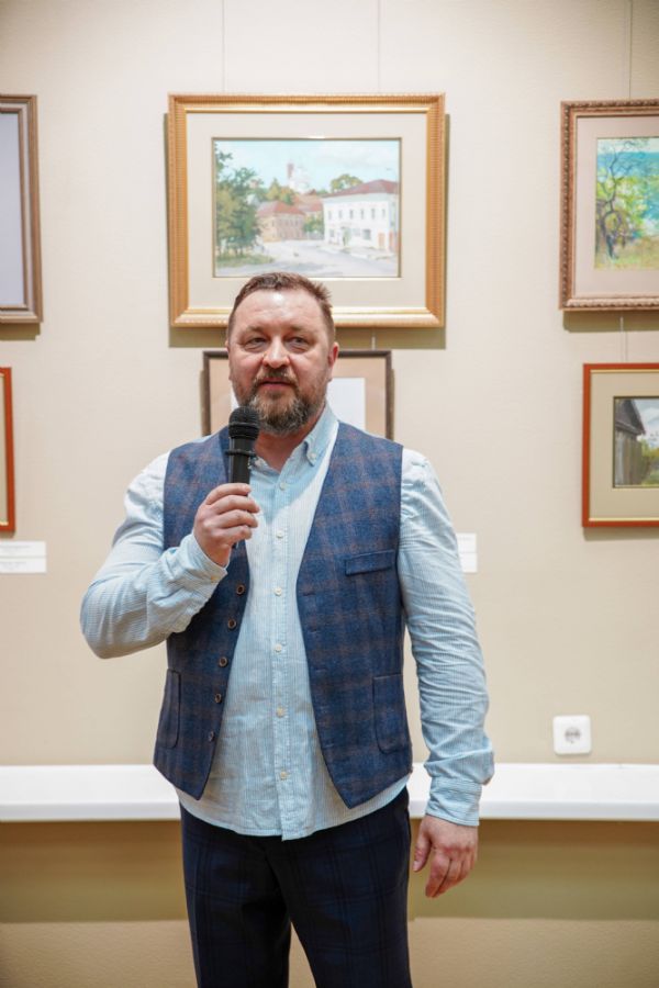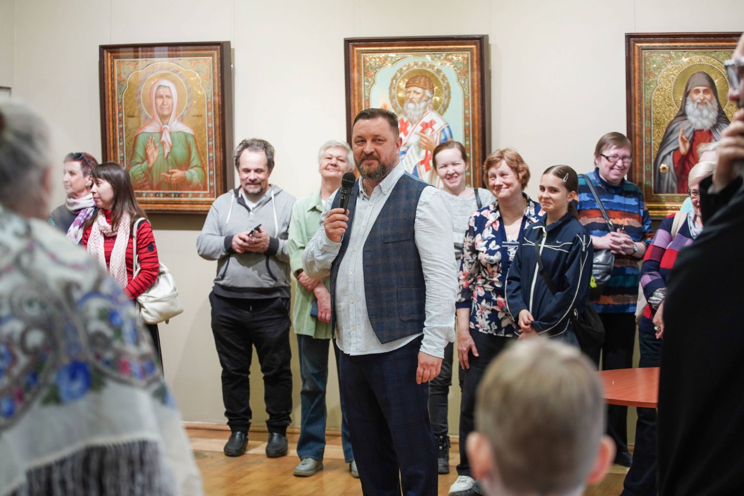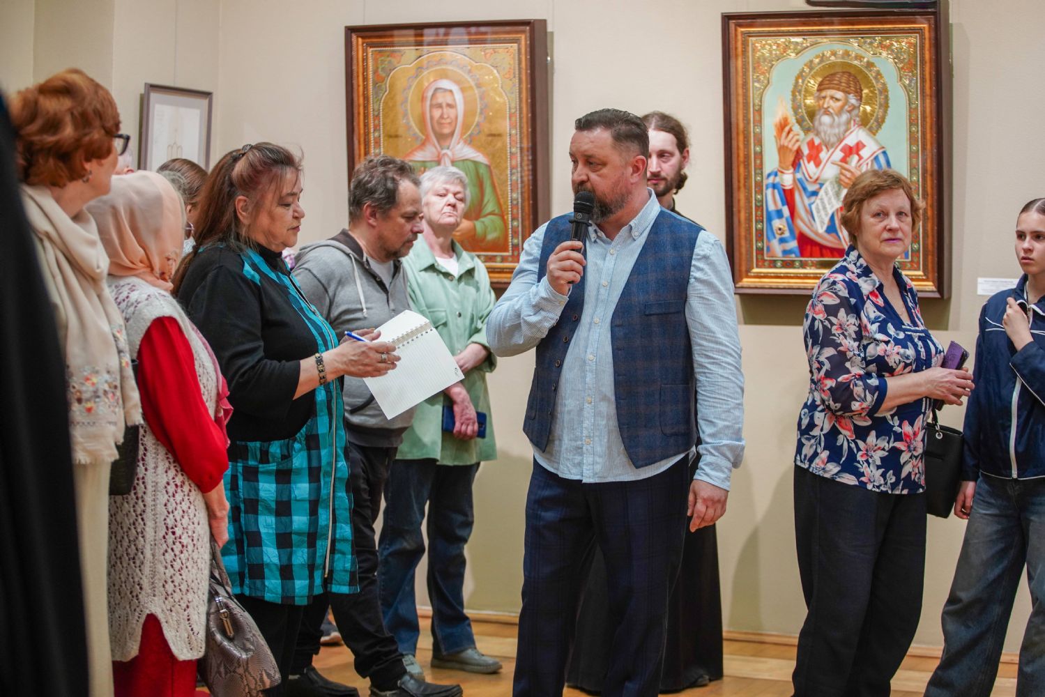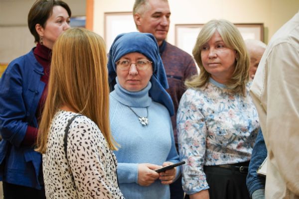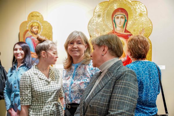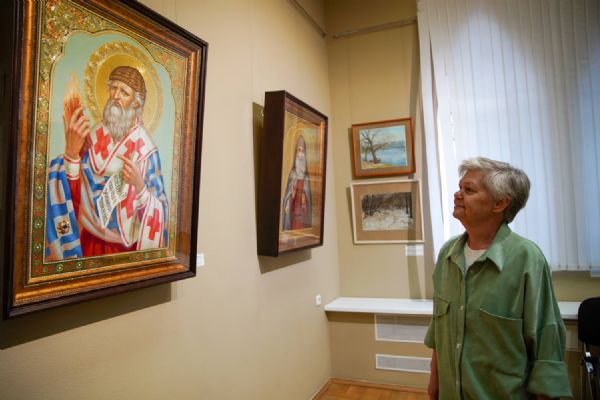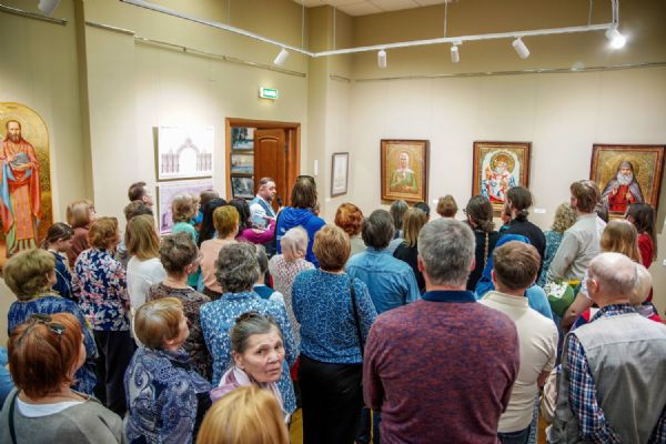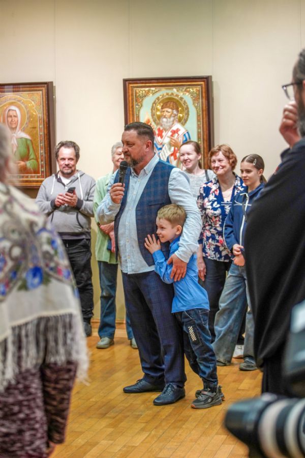 Автор представленных работ Станислав Попов провел для собравшихся экскурсию по экспозиции, рассказав о написанных им иконах и о изображенных на них святых, а также о технологии иконописи.