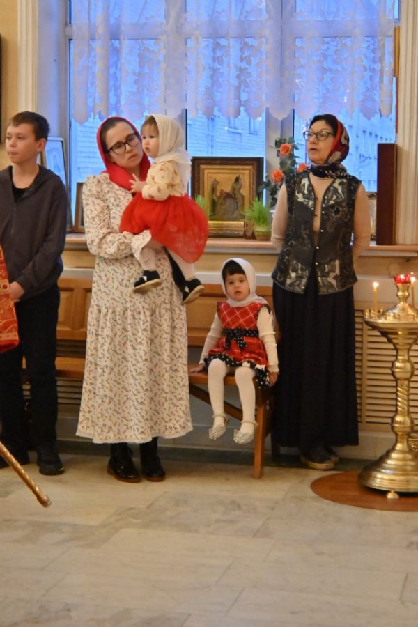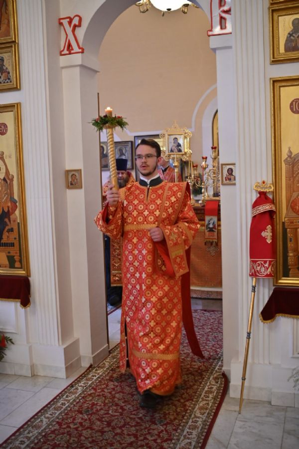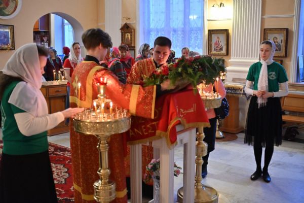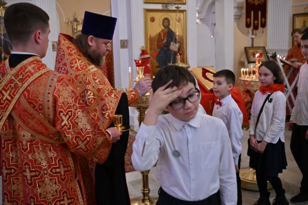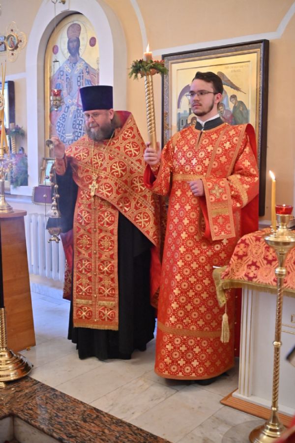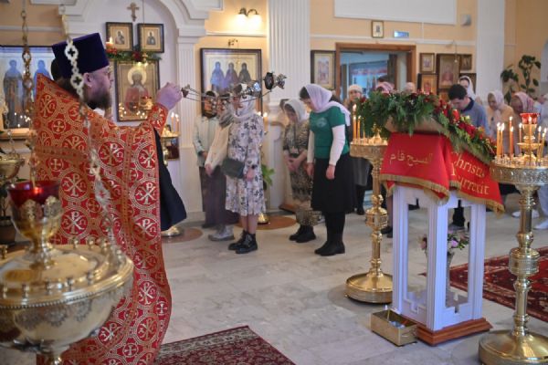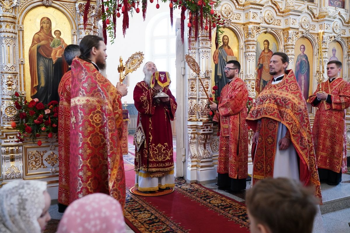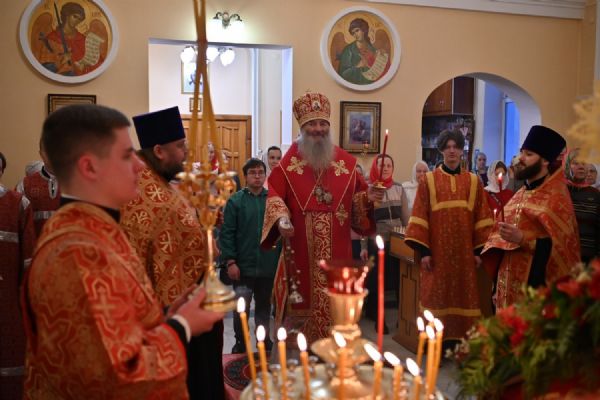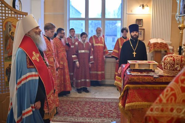 Архипастырю сослужили настоятель храма протоиерей Евгений Сурков, клирики храма иерей Андрей Иванов и диакон Никита Сурков. Песнопения исполняли хор храма под управлением Аллы Симаковой и детский хор гимназии имени Сергия Радонежского.