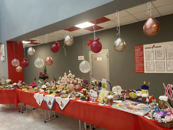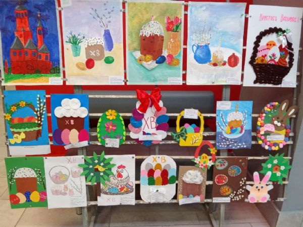 В фойе школы была представлена экспозиция поделок на пасхальную тему –расписные яйца (в техниках декупаж, бисероплетение, роспись), пасхальные венки, игрушки и сувениры, а также рисунки, аппликации и открытки с изображением праздничных атрибутов.
