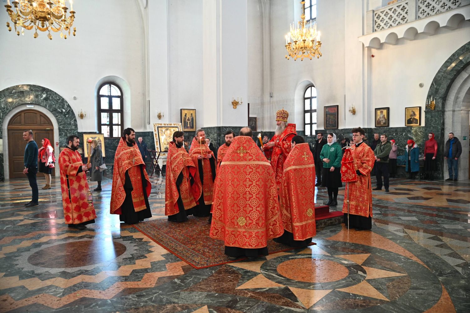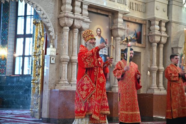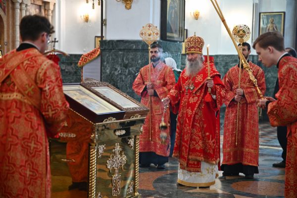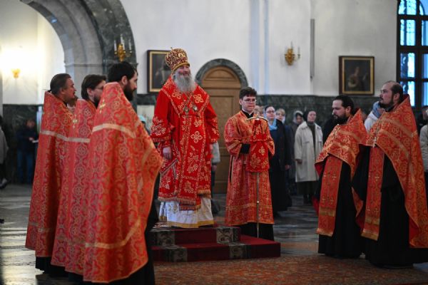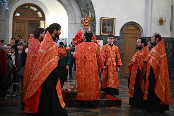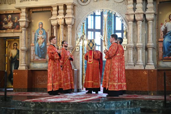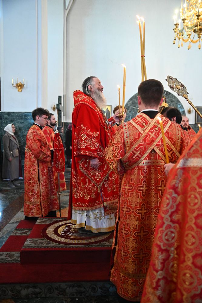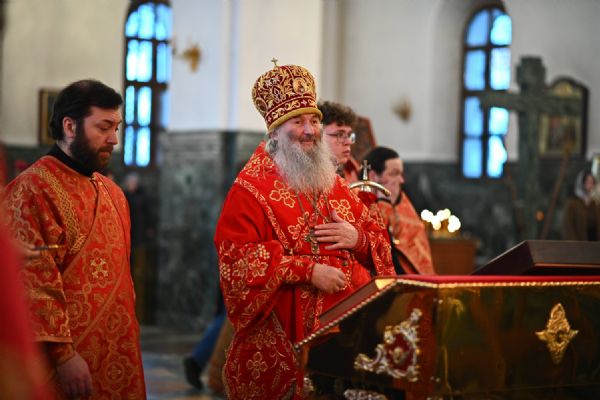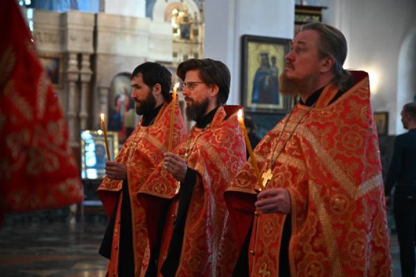 Владыке сослужили ключарь собора протоиерей Сергий Поглазов, клирики собора иереи Никифор Захаров, Евгений Самойлов, Александр Староверов, Иоанн Милютин и диакон Артемий Бобоч. Песнопения исполняли старший и младший составы архиерейского хора «Благовест» под управлением регентов Татьяны Черновой и Надежды Поздеевой.