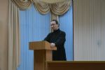 Торжественная часть состоялась в конференц-зале Православного центра и началась с теплых приветственных слов руководителя курсов иерея Александра Козлова. Затем член комиссии по канонизации святых клирик храма Рождества Пресвятой Богородицы Дмитрий Смирнов рассказал курсантам о жизни и подвиге священномученика Адриана Троицкого.