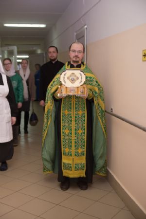 Подопечные социального заведения с благоговением приложились к мощам. Для тех, кто не может ходить, мощи были принесены непосредственно в палаты.