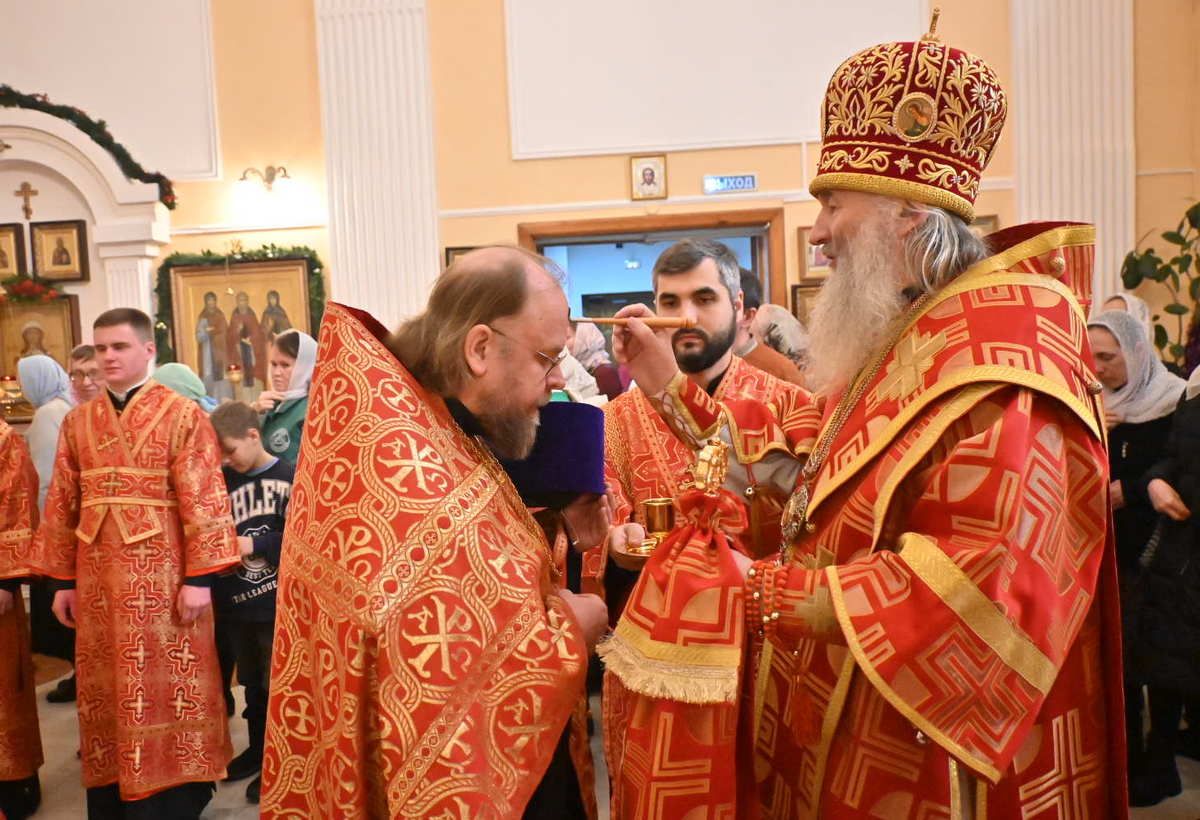 Владыке сослужили клирик храма Успения Пресвятой Богородицы города Йошкар-Олы иерей Алексий Михеев и клирик храма Рождества Пресвятой Богородицы села Семеновка протодиакон Михаил Козловский.