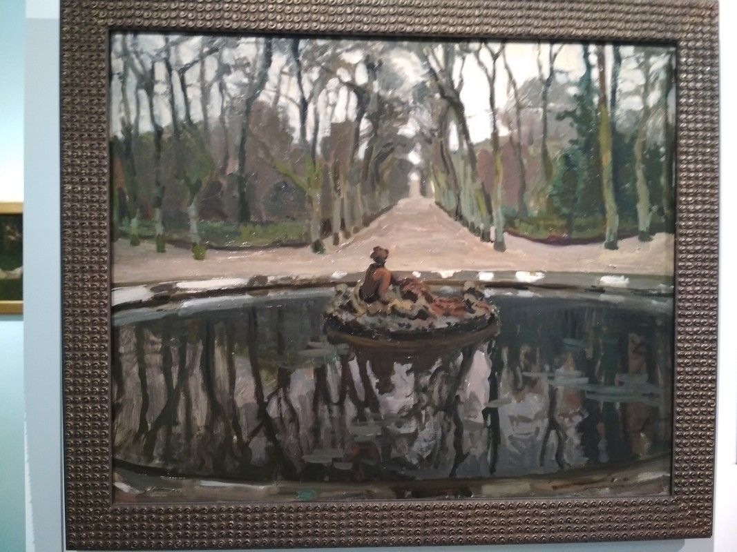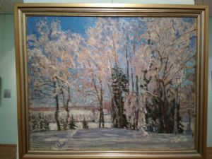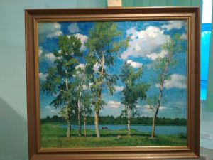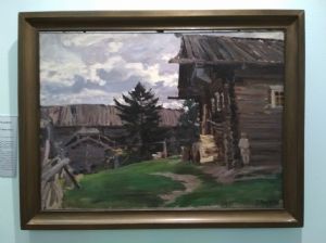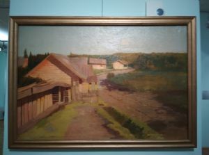 Самое сильное впечатление у меня оставила часть выставки, посвященная красоте природы. В самых обыденных сюжетах - затерянном в лесу озере, безымянной реке, деревенской улице - мир, мир, который за ежедневной суетой мы уже разучились замечать. Глядя на эти полотна, чувствуешь единение с природой, которая являет собой нерукотворный Божий храм, от посещения и созерцания которого очищается душа, жизнь наполняется смыслом, уверенностью. Полотна все разные, но есть одна главная мысль, которая объединяет их все – не человек главенствует над природой, а природа над ним. Для себя на выставке я открыла творчество художника Н.П. Крымова, представленное на выставке только одной картиной «Пейзаж с рекой».