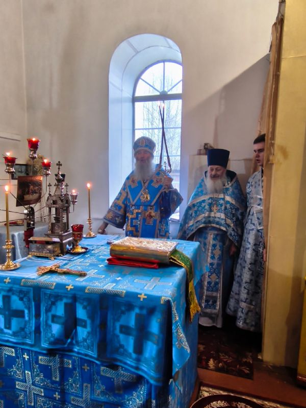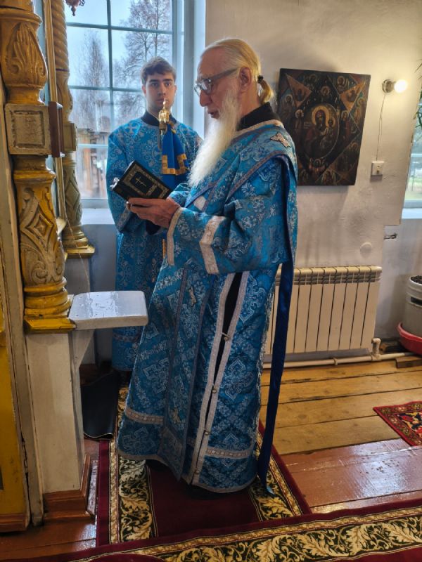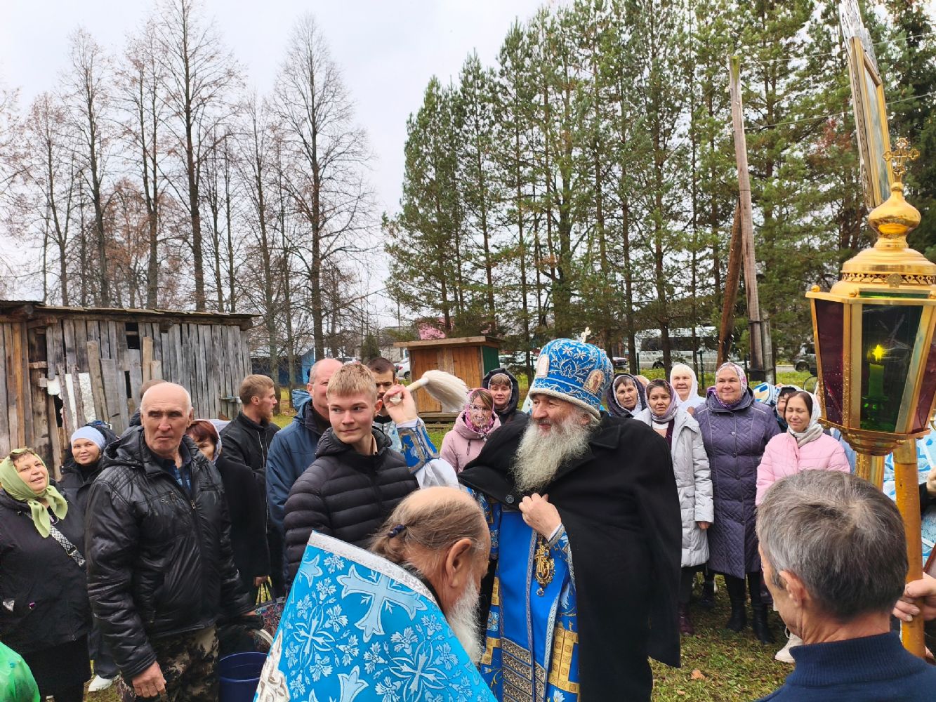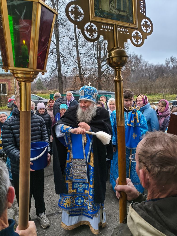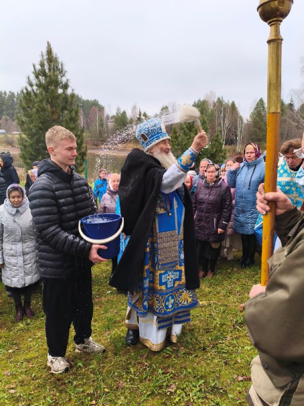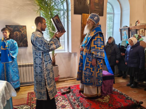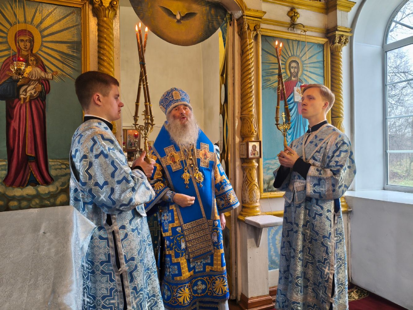 Владыке сослужили настоятель Покровского храма с. Упша протоиерей Михаил Нехорошков, настоятель Богоявленского храма с. Великополье иерей Олег Михайлов и протодиакон Михаил Козловский. Песнопения исполнял мужской хор Сретенского храма с. Кучка.