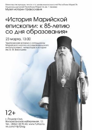 С основными вехами истории Марийской епископии, причинами и особенностями ее образования приглашаем познакомиться 23 марта в 13:00 в Музее истории Православия (Воскресенская наб., д. 12). Беседу проведет сотрудник МарНИИЯЛИ им. Васильева Юрий Витальевич Ерошкин.