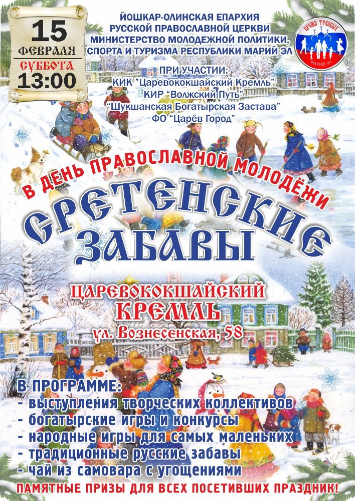 В праздник Сретения Господня, 15 февраля, отмечается День православной молодежи. В этот день, в Царевококшайском кремле, пройдут «Сретенские забавы».