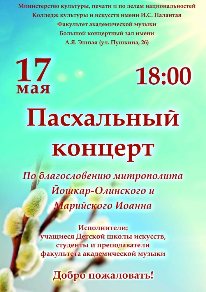 17 мая в 18.00 в Колледже культуры и искусств им. И.С. Палантая (ул. Пушкина, д. 26) по благословению митрополита Йошкар-Олинского и Марийского Иоанна состоится Пасхальный концерт. Вход свободный.