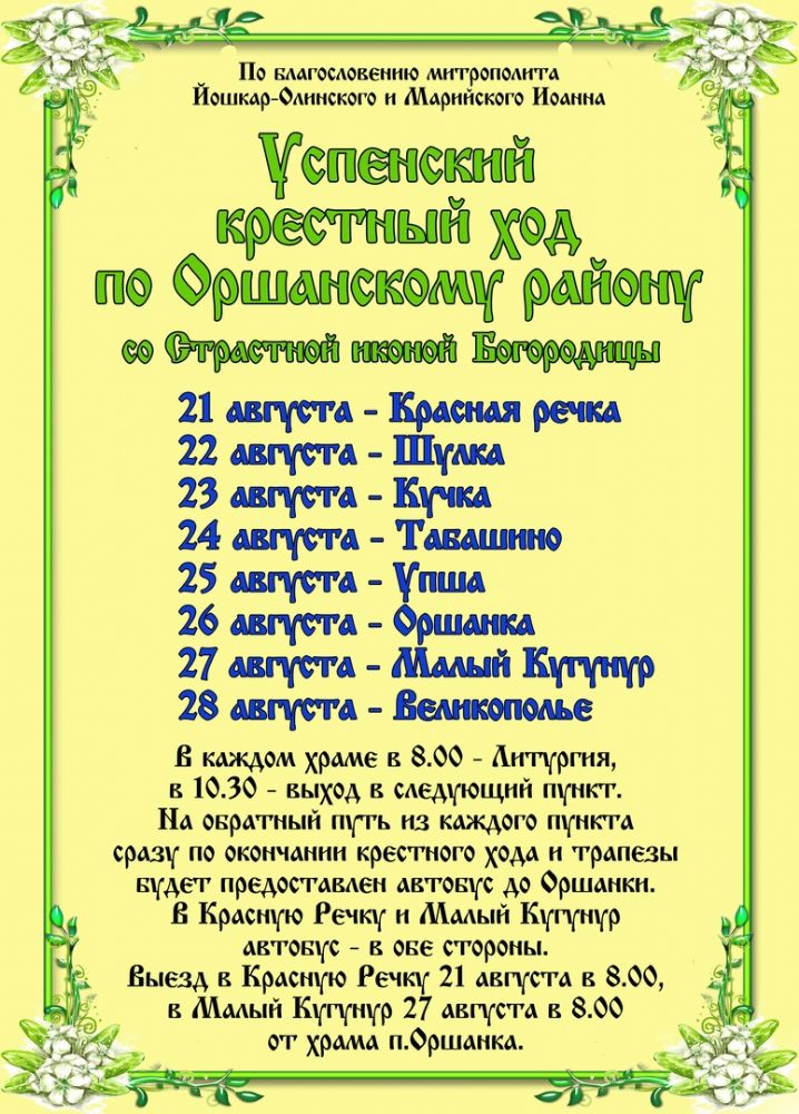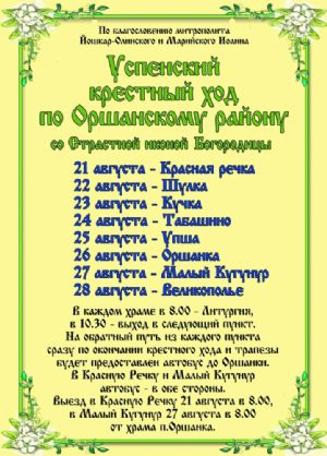 По благословению митрополита Йошкар-Олинского и Марийского Иоанна 21-28 августа в Оршанском районе состоится традиционный 110-километровый Успенский крестный ход. В этом году он пройдет с иконой Божией Матери «Страстная».