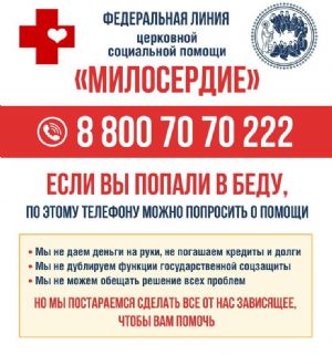 Федеральная горячая линия церковной социальной помощи «Милосердие» организована Синодальным отделом по церковной благотворительности и социальному служению Московской Патриархии по благословению Святейшего Патриарха Кирилла.
