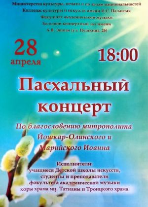28 апреля в 18.00 в Колледже культуры и искусств им. И.С. Палантая по благословению митрополита Йошкар-Олинского и Марийского Иоанна состоится Пасхальный концерт.