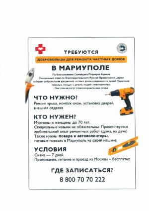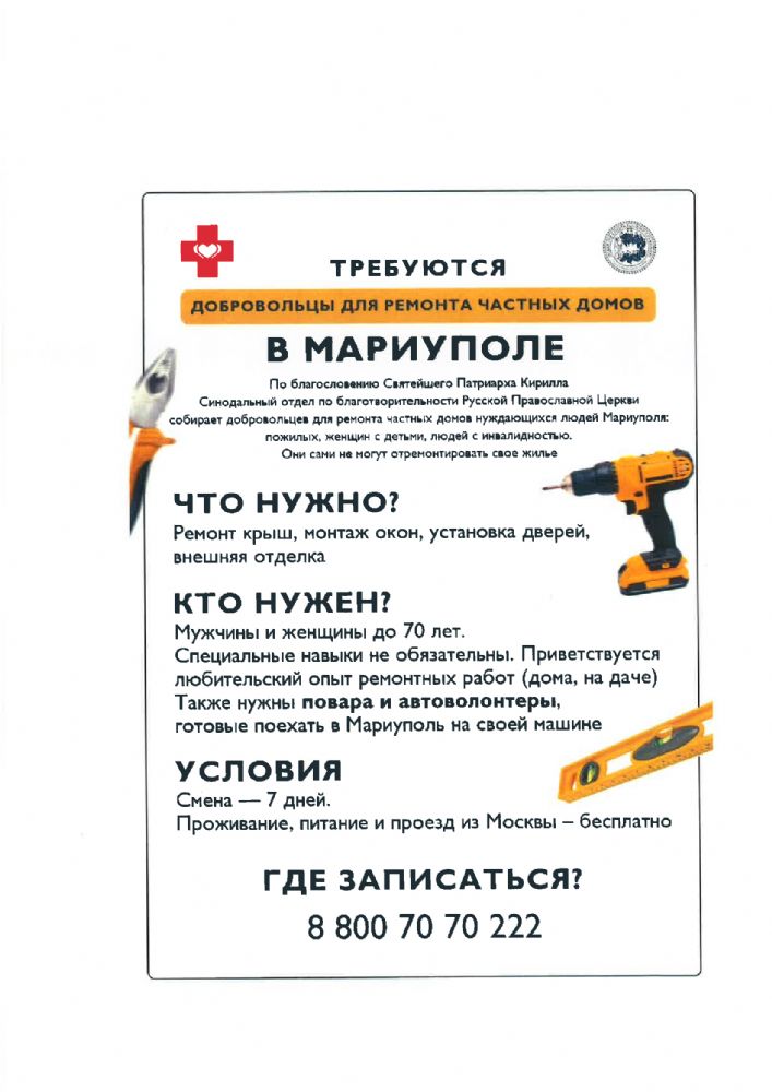 Чтобы стать добровольцем-ремонтником в Мариуполе, необходимо позвонить по телефону горячей линии церковной социальной помощи «Милосердие»: 8 800 70 70 222.