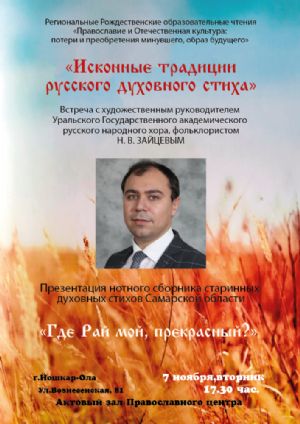 Во время мероприятия состоится презентация нотного сборника духовных стихов составленного Н.В. Зайцевым по материалам фольклорных экспедиций по Самарской области – «Где Рай мой, прекрасный?». Николай Вячеславович расскажет об истории возникновения и традициях исполнения народно-певческого жанра русского духовного стиха, о разнообразии религиозно-обрядовых духовных стихов, представит аудио- и видеоматериалы фольклорных экспедиций с записями исполнений старинных духовных стихов.