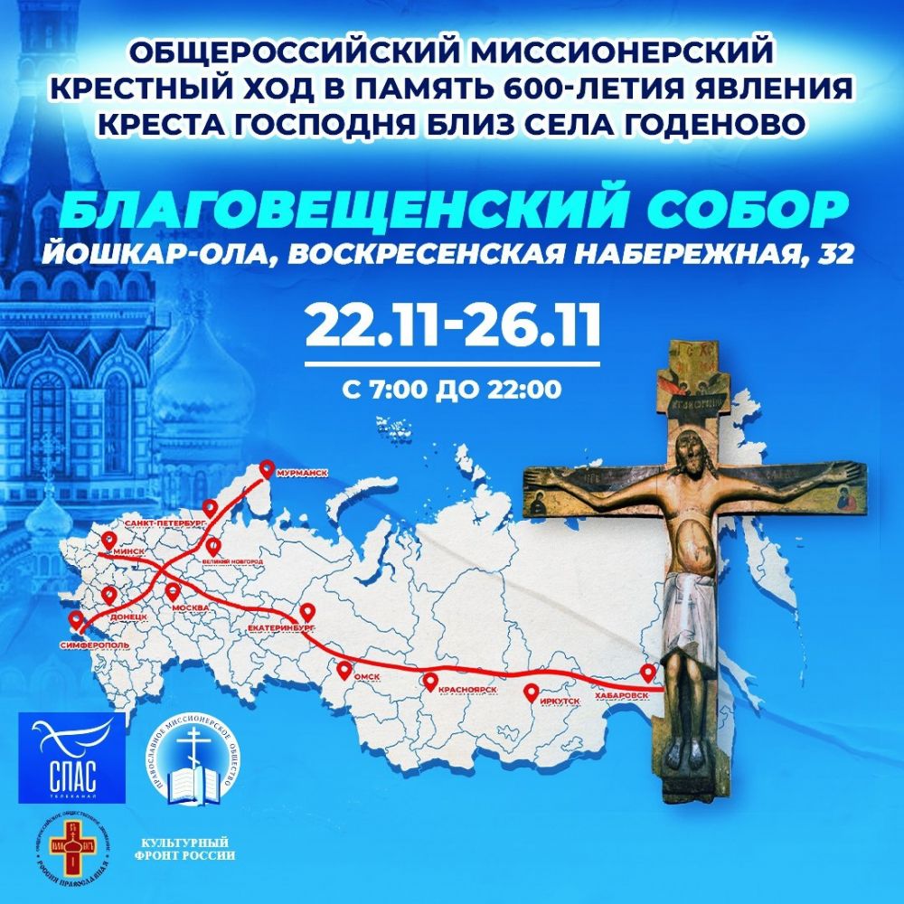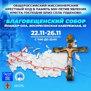 С 22 по 26 ноября в Благовещенском кафедральном соборе г. Йошкар-Олы будет пребывать копия чудотворного Годеновского Креста. Святыня прошла по стране в рамках Общероссийского миссионерского крестного хода, посвященного 600-летию явления Креста Господня близ села Годеново.