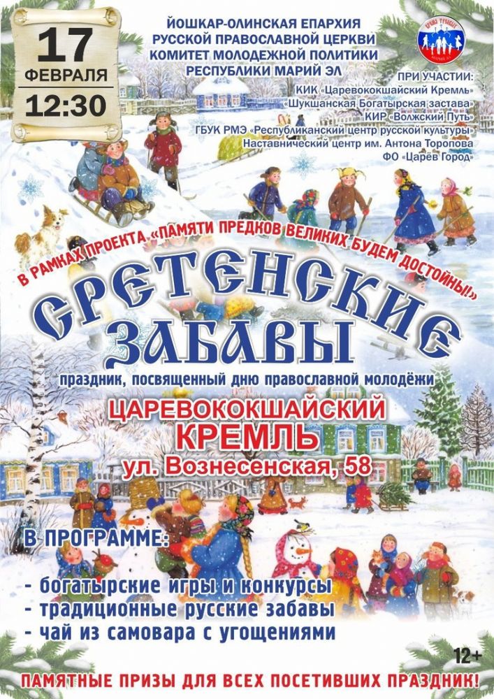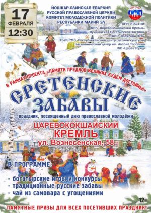 17 февраля в Йошкар-Оле, в Царевококшайском кремле пройдут традиционные «Сретенские забавы», приуроченные ко Дню православной молодежи. Начало в 12:30.