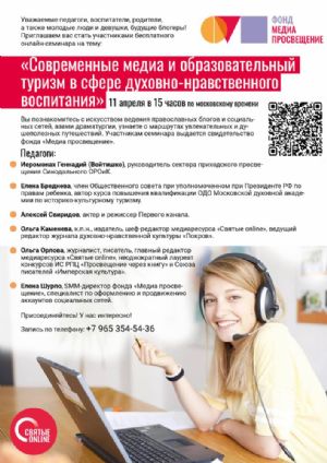 11 апреля в 15:00 фонд «Медиа просвещение» проводит бесплатный онлайн-семинар «Современные медиа и образовательный туризм в сфере духовно-нравственного воспитания».