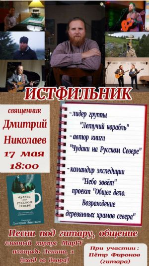 Отец Димитрий – руководитель экспедиции «Небо зовет!» в рамках проекта «Общее дело. Возрождение деревянных храмов Севера», автор книги «Чудаки на Русском Севере», выпускник Российской академии музыки им. Гнесиных, автор и исполнитель собственных песен, лидер музыкальной группы «Летучий корабль», автор музыки к ряду игровых, документальных и анимационных фильмов.