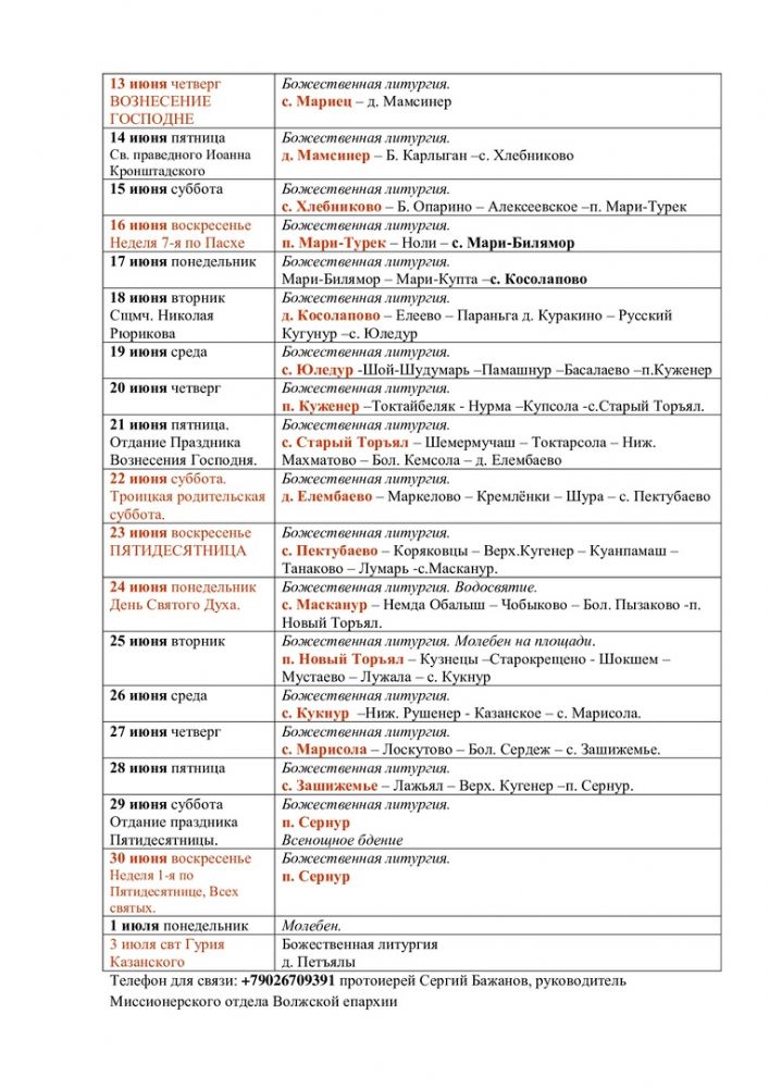 29-30 июня, суббота-воскресенье: богослужения в храме п. Сернур;