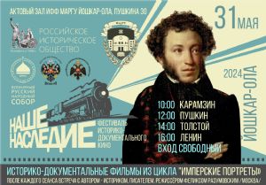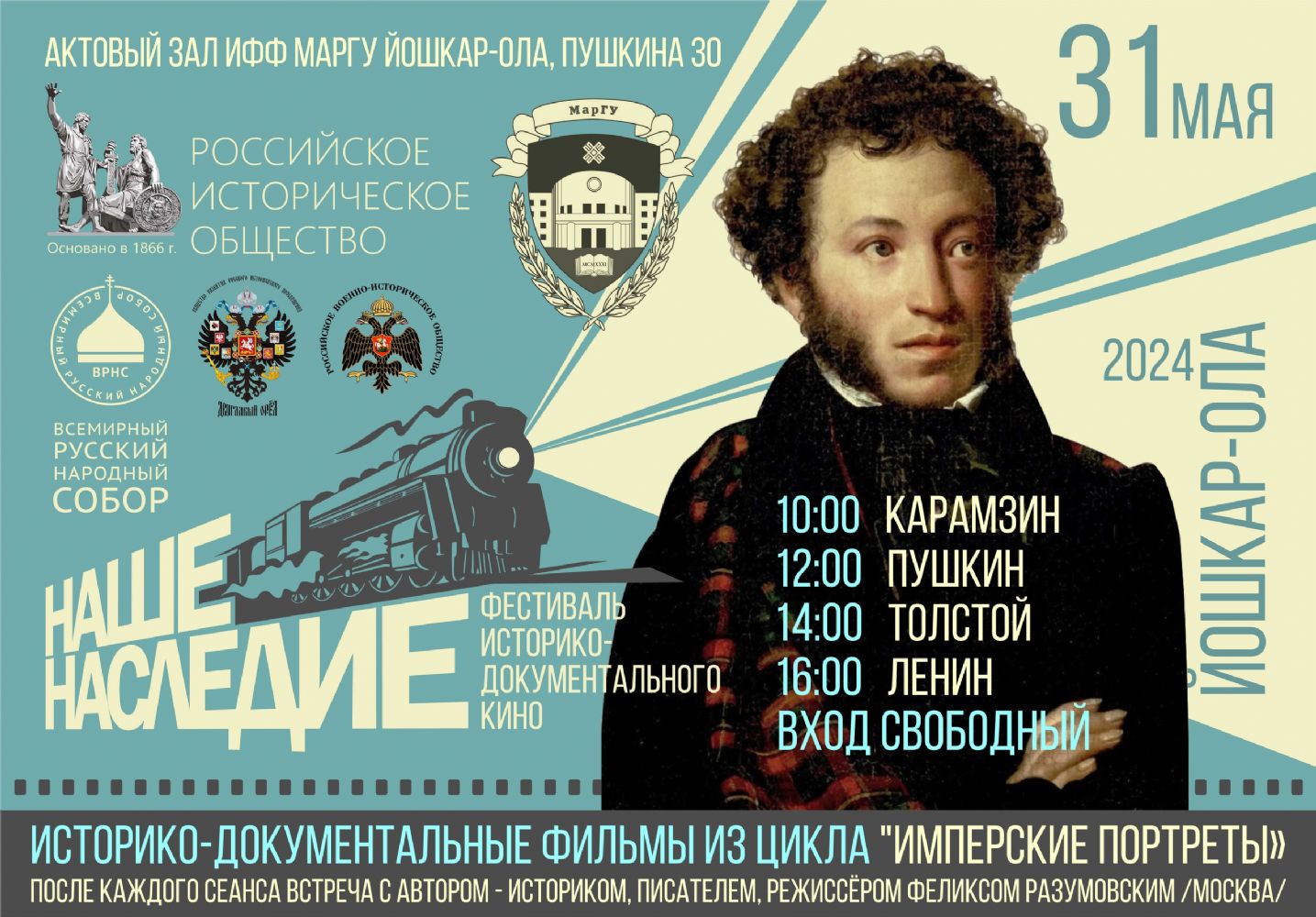 31 мая (пятница) в актовом зале историко-филологического факультета Марийского государственного университета (Йошкар-Ола, ул. Пушкина, дом 30) пройдёт фестиваль историко-документального кино «Наше наследие».