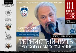 А в субботу, 1 июня в 11.30 по тому же адресу (актовый зал ИФФ МарГУ, Йошкар-Ола, ул. Пушкина 30) Феликс Разумовский прочтёт лекцию на тему: «Тернистый путь русского самосознания».