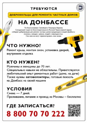 Синодальный отдел по благотворительности Русской Православной Церкви продолжает набор добровольцев для ремонта разрушенных квартир и небольших частных домов пострадавших мирных жителей в Мариуполе и других городах Донбасса.