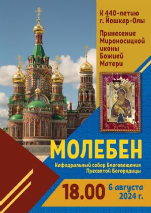 6 августа в честь 440-летия города Йошкар-Олы в кафедральный собор Благовещения Пресвятой Богородицы будет принесена Мироносицкая икона Божией Матери, перед которой в 18:00 будет совершен молебен, возглавит который митрополит Йошкар-Олинский и Марийский Иоанн в сослужении духовенства городских храмов.