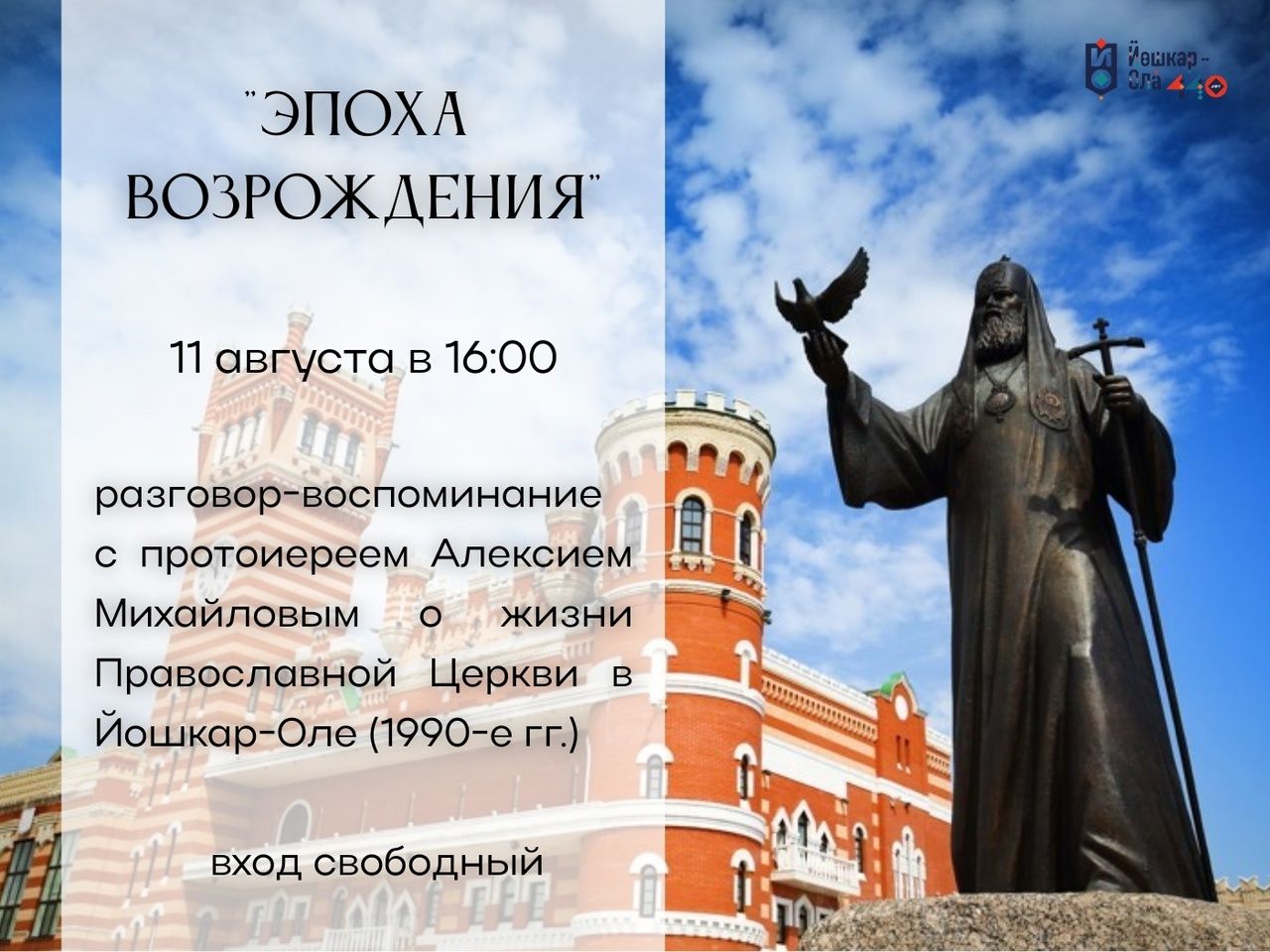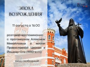 Встреча-беседа «Эпоха возрождения» приурочена к 440-летию г. Йошкар-Олы. Будем вспоминать, как возрождалась церковная жизнь в постсоветские десятилетия в нашем городе.