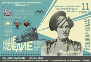 11 октября в актовом зале Дворца молодёжи Республики Марий Эл (Йошкар-Ола, ул. Зелёная, 1) состоится открытие третьего сезона фестиваля историко-документального кино «Наше наследие», в рамках которого будут организованы два сеанса открытого показа историко-документального фильма «Первая мировая. Начало». Начало сеансов в 10:30. и 14:00.